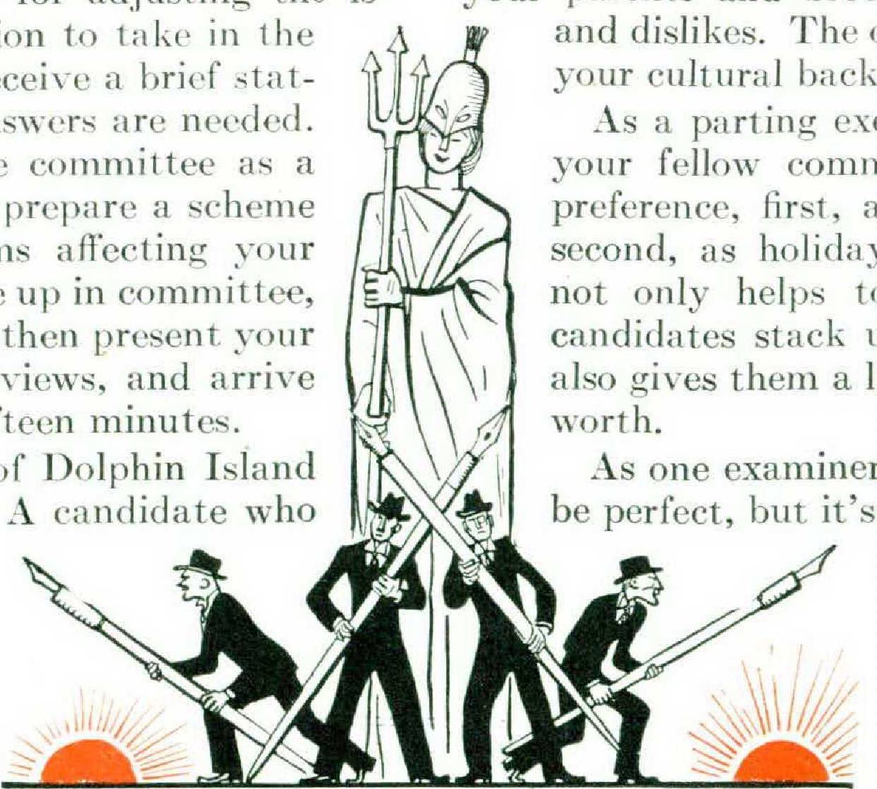 The nature and problems of Dolphin Island vary with each house party. A candidate who has tackled them once can’t coach another who hasn’t. Sometimes, after that first glance at the island file, you are required, as a government official, to write a tactful letter to a private individual, asking for special concessions which the island government needs. Or, when you represent a department, you may have an axe to grind. A girl representing the Department of Education, for example, had to argue for bigger educational grants for both natives and whites. The Labor Department opposed, on the ground that there were not yet enough professional jobs available for natives to justify extending their school facilities.