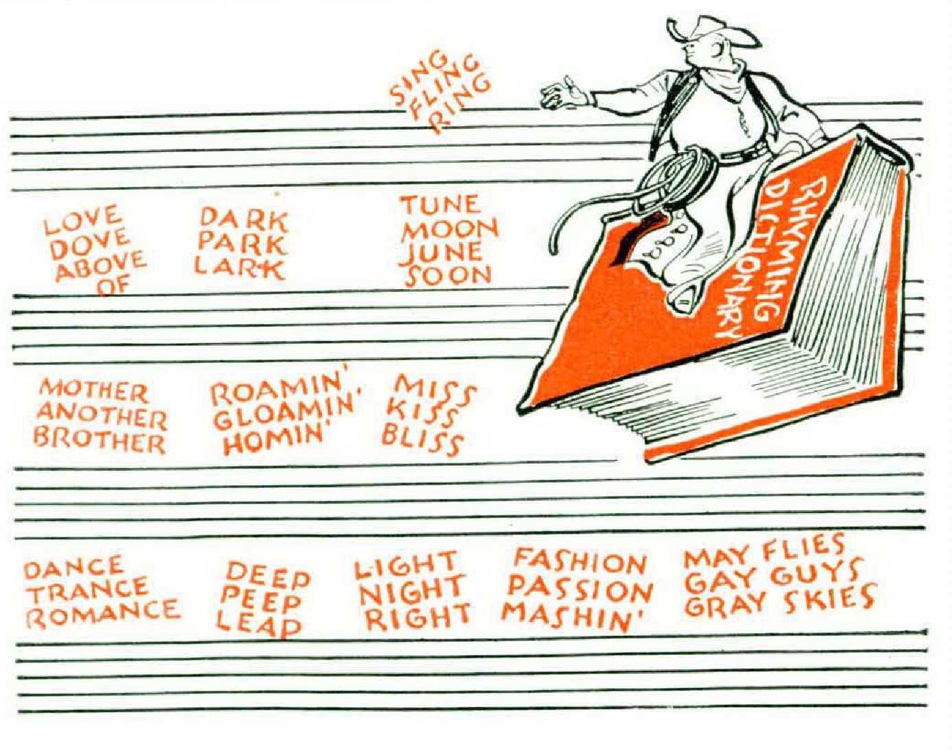 This all dawned on me while I was speculating about the going-home song, a type always well represented on the publishers’ lists. The singer is represented as being tired of roaming, or roving, and anxious to get back, back, back to his home — i.e., his parents’ home. I asked myself why there were no going-away-from-home songs; afier all, every man who goes home must have left home. And come to that, what have these people been doing while they were away from home? Roaming, to be sure, roaming or roving; but that isn’t very definite, is it? Barge captain? Vaudeville actor? Airline pilot? Itinerant peddler? You never know.