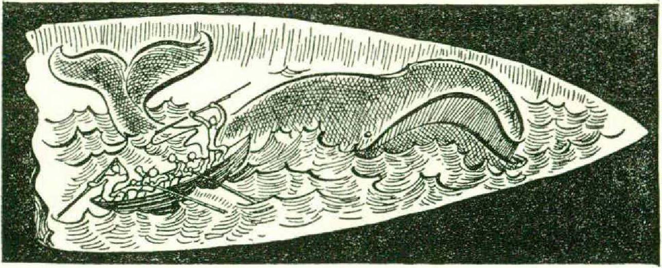 The turning of whale’s teeth into mantelpiece ornaments came in with the revival of sperm-whale hunting in the second century of that industry’s American history. In the old days of whaling, the Nantucket whalemen took all the oil they could handle from dead whales drifting offshore. When the Christopher Hussey was blown out to sea in the year 1712, the first sperm whale was killed by an American whaler and a new form of hunting developed. Such a whale had been cast up on the coast of Norfolk nearly a hundred years before that, and Sir Thomas Browne tells how the people had gathered to admire its immensity. Sir Thomas observed with surprise that the sperm oil came from the head and not from parts “official to generation”; and that the mammal, unlike finback and sulphur-bottom, had a lower jaw with a nice set of teeth.