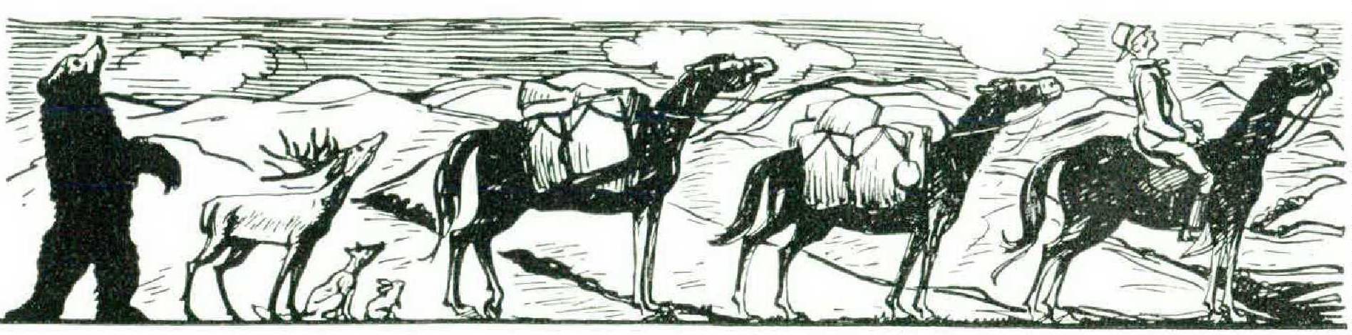 We were up before daylight. Billy Meyers and his wife gave us a breakfast that was guaranteed to stick to the ribs. It was a job gelling the horses all saddled and the packs adjusted. Each side had to be balanced so that the packs would not roll or slip — bedrolls, tents, and bulky stuff on lop, and the small, heavy stuff riding in the panniers below.