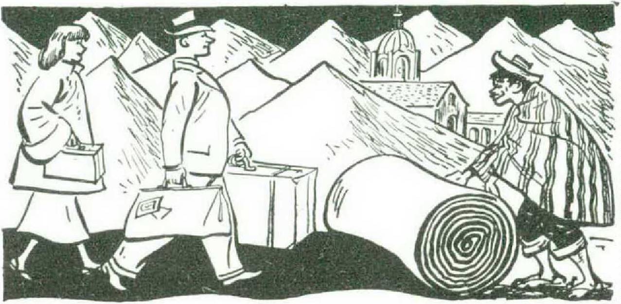 A one-week trip to Cuzco for a look at the pre-Inca ruins, stopovers with Tia Bates at her Arequipa Quinta, and unhurried journeys to Sacsahuamán, the Indian Fair at Pisac, and Machu Picchu totaled 1059 soles — $65.12 or $9.30 a day. This included air passage from Lima to Arequipa and return, Pullman to and from Cuzco, sight-seeing, lips, and all taxes.
