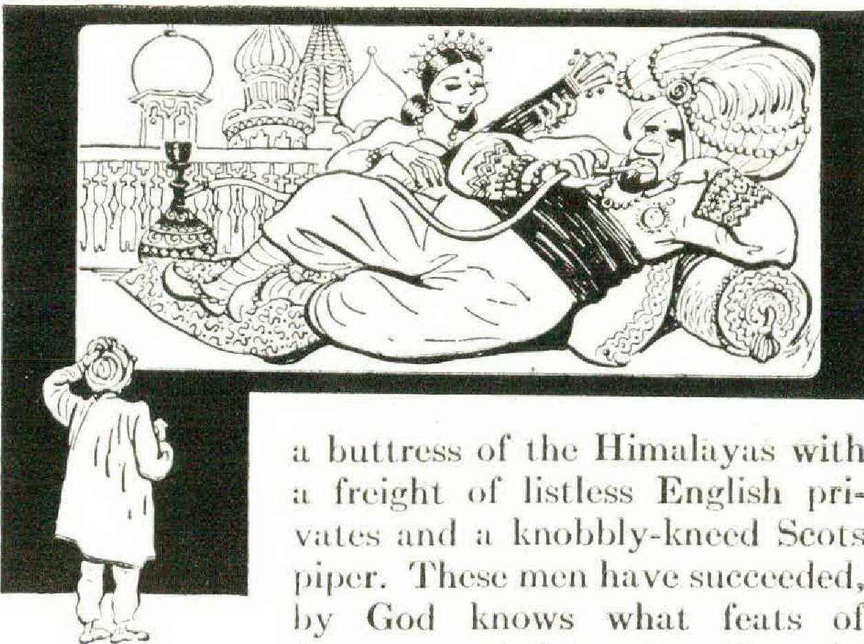 Litter we come upon an elderly elephant caparisoned for a fair in faraway Bengal and looking unhappy, as well he might, climbing unsteadily up a buttress of the Himalayas with a freight of listless English privates and a knobbly-kneed Scots piper. These men have succeeded, by God knows what feats of forgery and impersonation, in joining the Bengal Lancers, which, in my time at least, used not to have any British personnel except commissioned officers. The elephant’s mahout maintains he is a Sikh, but since he is very black, a loot or two under height, has no beard, smokes a hookah in blatant defiance of his religion, and has borrowed a turban from a Mahratta stable buy, we suspect him of being the hero in a baflling disguise — perhaps George Raft himself.