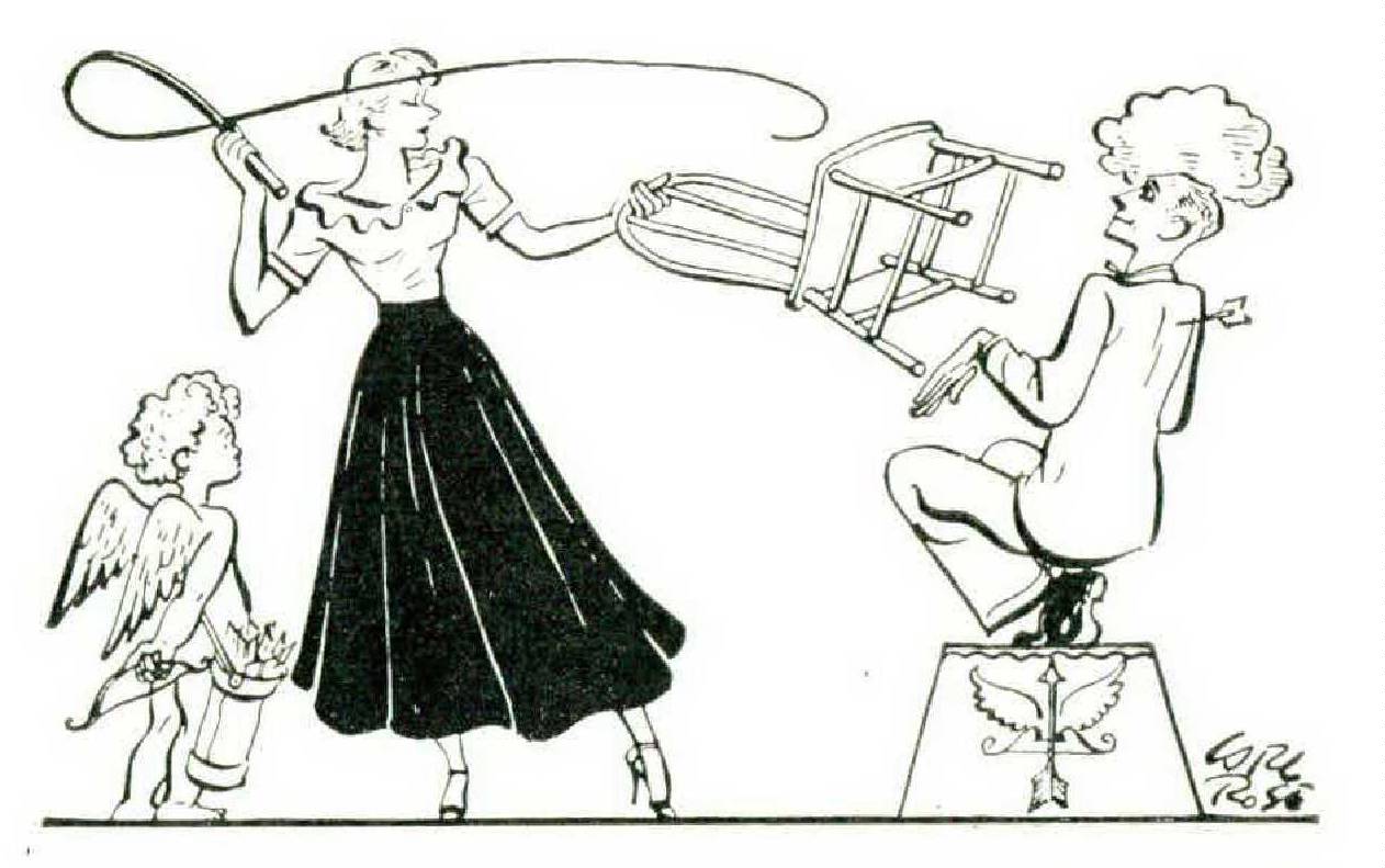 A typical test run should be made fairly early in the contest, on what the man might have devised as a gala evening. He has started the day by sending a long telegram of an ardent nature, flowers and gewgaws later on, with dinner and the theater to follow. He arrives, beaming, at seven P.M. in a dinner jacket. The girl bursts into tears. What’s the matter? Sobs, tears — go away! What can it be? Near hysterics; girl disappears to bedroom. Short pause. Girl reappears, after what he believes was emotional struggle but what was in fact restoration of make-up. She is aloof but composed.