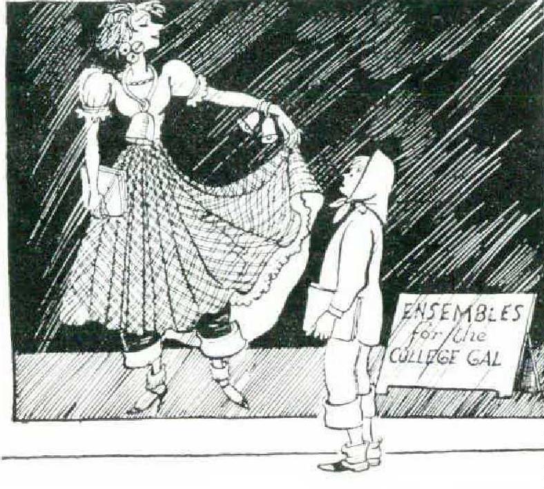 In addition to these excesses, disagreements, and bickerings, the College Issues are guilty of tossing out irresponsible statements which further upset the already confused Fashion Picture. “Commonsense fashions have a way of spreading from East to West or West to East,” said one of them, and it is common knowledge that this statement has had a paralyzing effect on the flow of fashion. Girls on Eastern campuses don’t know whether to copy girls on Western campuses, or whether the Western girls should be copying them. And vice versa. While there is still some spreading from North to South, no fashions are moving at all between East and West, in either direction.