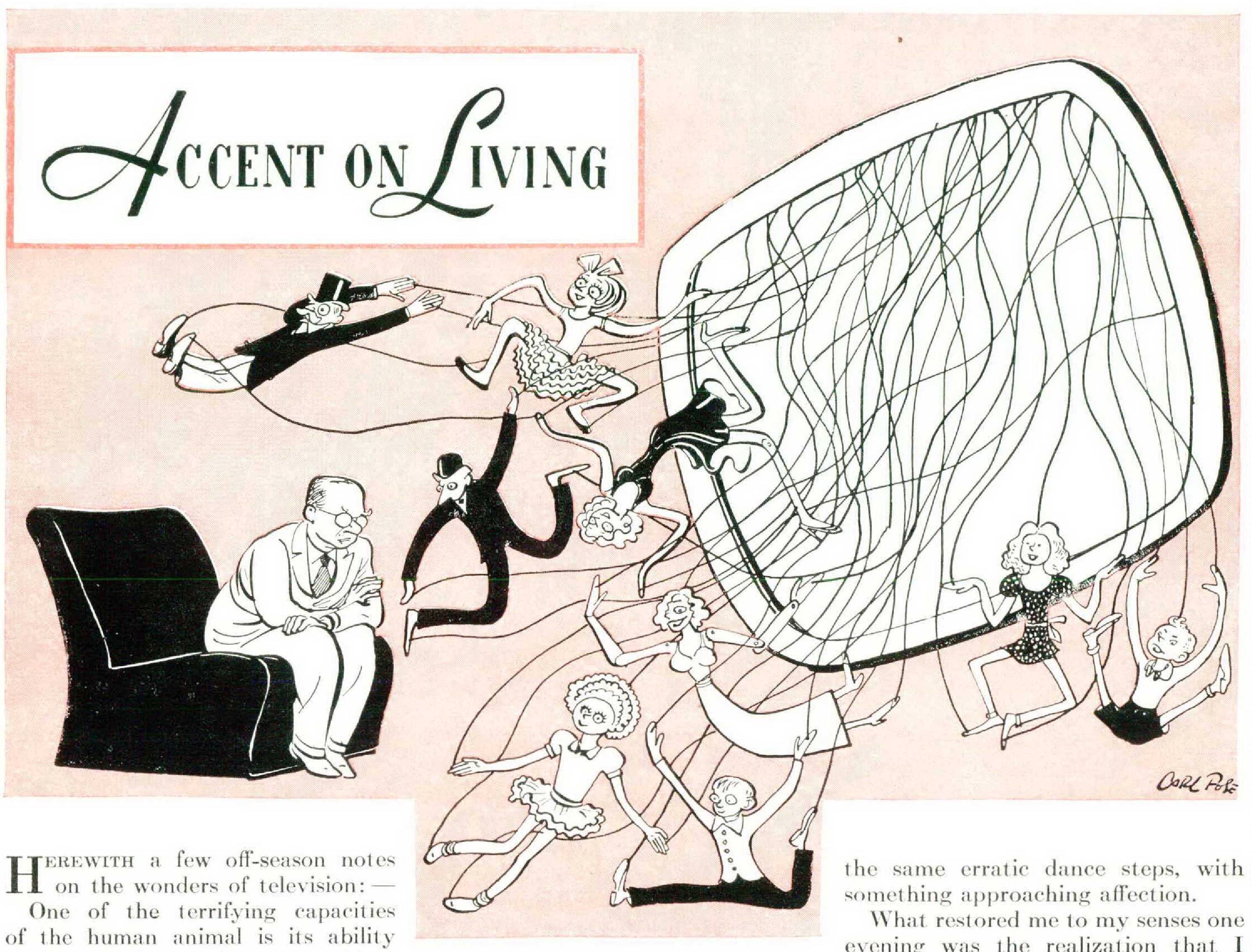 I became aware of just such a tendency in myself when I fell into a routine of catching each night a TV weather report. TV being what it is, it obviously would not do to broadcast the next day’s weather and let it go at that. Not at all. This bulletin came in the form of a sponsored playlet. It began with an overblown commercial for a bank. Music followed, a gay little air. Then curtains parted, disclosing two marionettes. The man marionette looked like one of those sculptured roués featured on Esquire’s cover — same mustache, spats, natty outfit, and beckoning eyes. The girl was bosomy.
