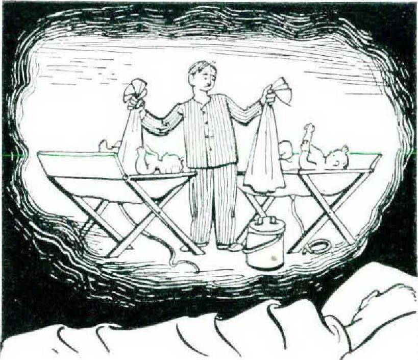 After that I tried to live up to my part as far as I could judge what it should be. I did such accepted things as giving out pairs of cigarettes instead of cigars and interlarded my conversations with feeble witticisms about “double trouble” and “seeing double.” It was tough going but people seemed to appreciate it. Actually, I doubt whether I need have done anything. The initiative was taken from me; I was typed and could do nothing about it. When people hear you have had a baby, they smile. When they hear you have had twins, they laugh.