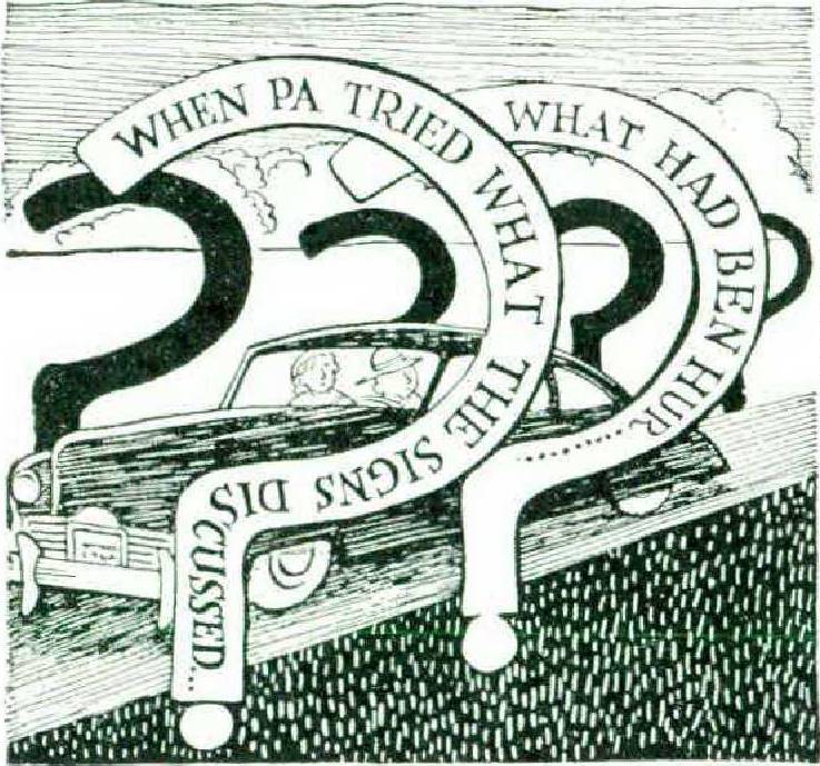 The trouble came during the intervals when my wife was spelling me at the wheel. At such times I indulge my fondness for studying road maps, between that and counting red barns us. white barns in a game with my daughter. I kept landing in the middle of a jingle. I wouldn’t notice it was going by until it was half gone. Once, for instance, I glanced up just in time to read two boards with this on them: —