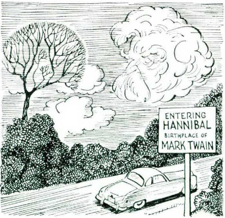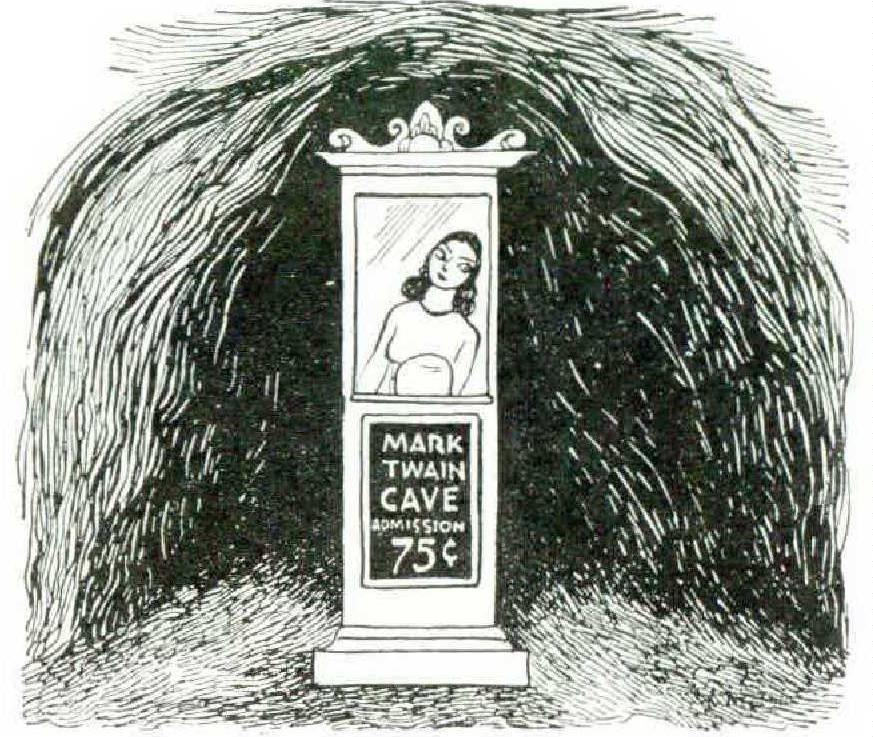 I turned and started down Main Street for the Mark Twain Cave, Hannibal’s greatest natural wonder. The cave is situated in a hill two miles south of Hannibal, a short distance from Mark Twain’s River. Some say this river is identical with the Mississippi, but in Hannibal that seems unlikely. Mark Twain never owned the cave — any more than he ever owned the river — but he did get lost in it once, thereby providing himself with the raw material for one of his most famous scenes. Someone owns it now, and it costs a visitor seventyfive cents to go in with a guided party to see where Mark Twain used to play cops and robbers for free.