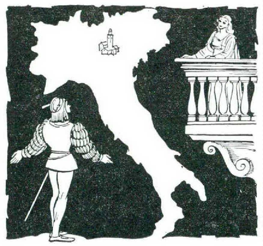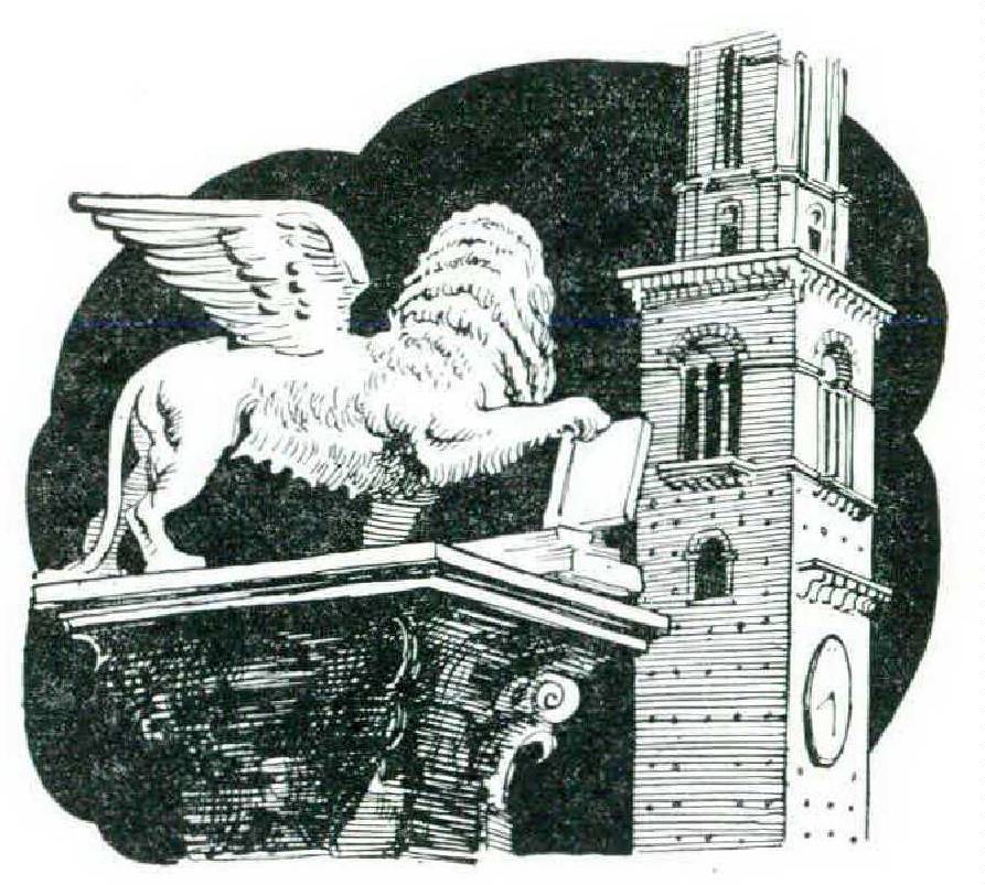 Or should one turn left, into the Piazza delle Erbe, where the vegetables are sold against a background of frescoed palaces? At one end stands a winged lion, the seal of Venetian conquest after the Scaligeri had lost their reign. At the other end, facing the lion, there is the touchingly humble statue of the Virgin, shrouded in the threefold jet of a fountain, as though hidden behind a watery curtain. Further away, dominating all the roofs around, is the tower from which a cannon is fired every time a tempest darkens the sky of Verona — to dispel the thunderclouds, according to an old belief.
