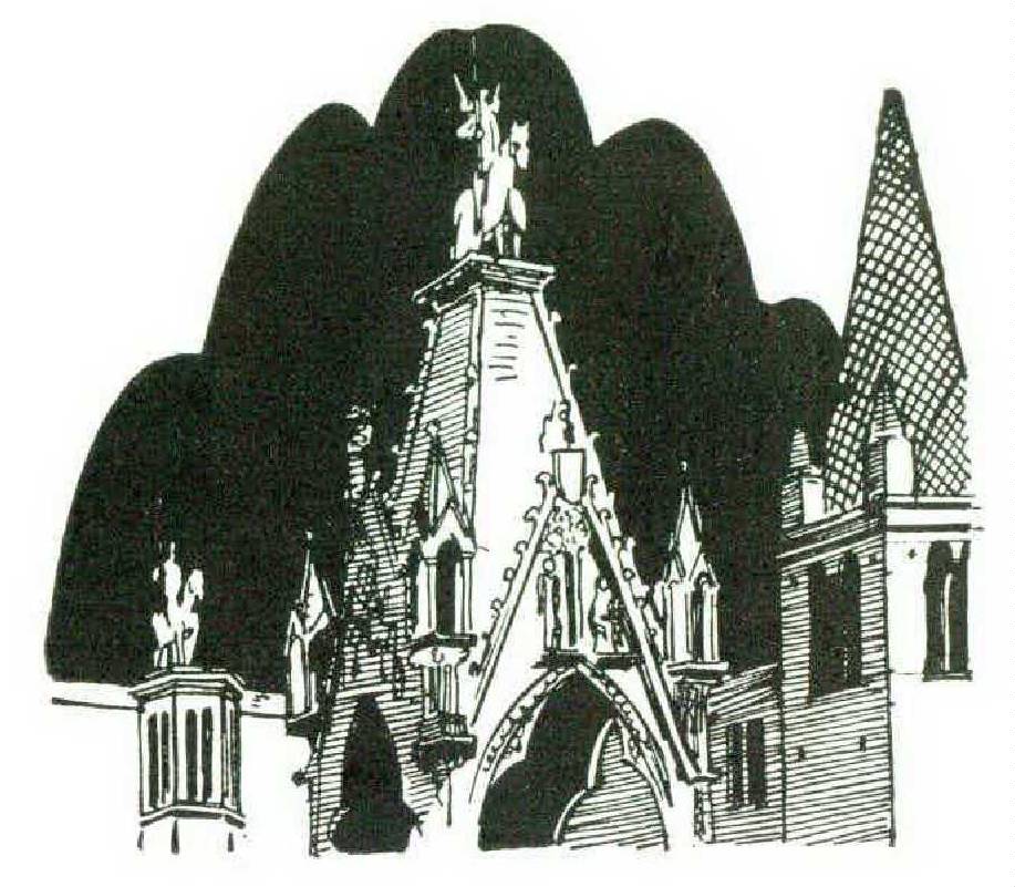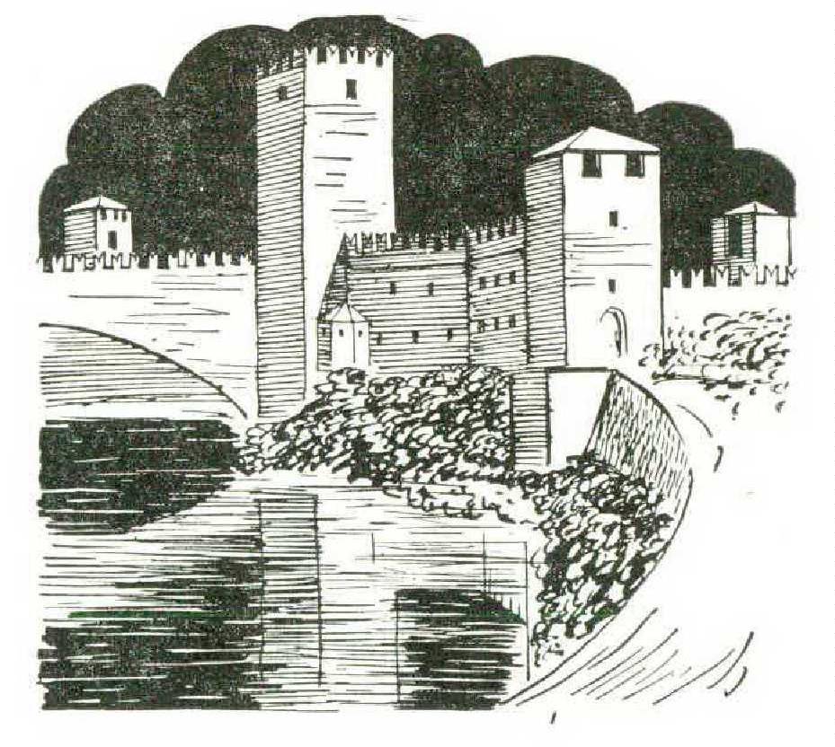 But it is not only here that the Scaligeri left a monument of their might; we find it in the Castel Vecchio, their fortified stronghold which dominates the bank of the gray fastcoursing waters of the Adige. And although today it has been turned into a picture gallery, one still has to cross the drawbridge to gain entrance. There is the bishop’s residence bristling with the same crenelations as the fortress — those fierce crenclations which are cleft down the center like snakes’ tongues. And they appear once more on the menacing old bridge, which was fortified too.
