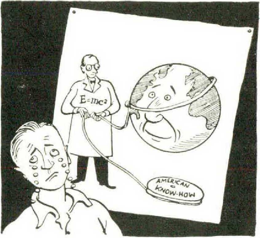 It takes little extrapolation to perceive the end result. Except for a few obdurate Amishmen, chin whiskers are relics of the past. Why, then, should Uncle Sam, the up-to-date, world-leading Uncle Sam, still sport that ridiculous, outmoded little goatee? And as for those striped pants with the strap under the arch, that outrageous beaver hat, that ludicrous 1820 tailcoat — uh! The future Uncle Sam—the Uncle Sam given the seal of approval by Science — will be a balding gentleman with horn-rimmed glasses, wearing a laboratory smock upon which is imprinted an arcane equation (E=mc2, while becoming a bit corny, looks durable enough to do for that nonce). In his hand he may be holding a longish length of plastic tape. Indeed, why not show him lassoing the world with his technical know-how (that would be symbolized by the tape, of course), the world symbolized by the usual sphere, assuming that Science still holds the world to be a sphere? Come to think of it, Uncle Sam would resemble, of all people, a physicist. This should certainly leave the scientist happy, but its effect on the cartoonist could best be symbolized by a drawing of his dolorous countenance with little hamburger buns streaming down his cheeks.