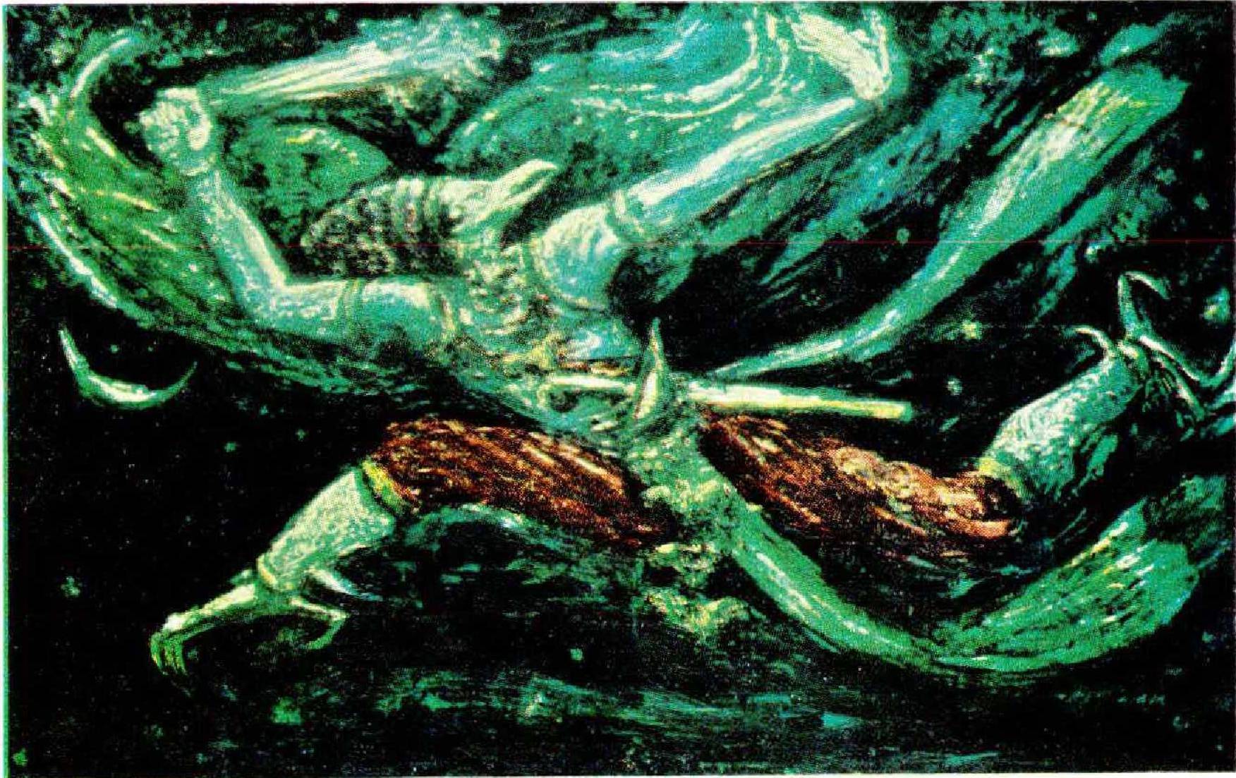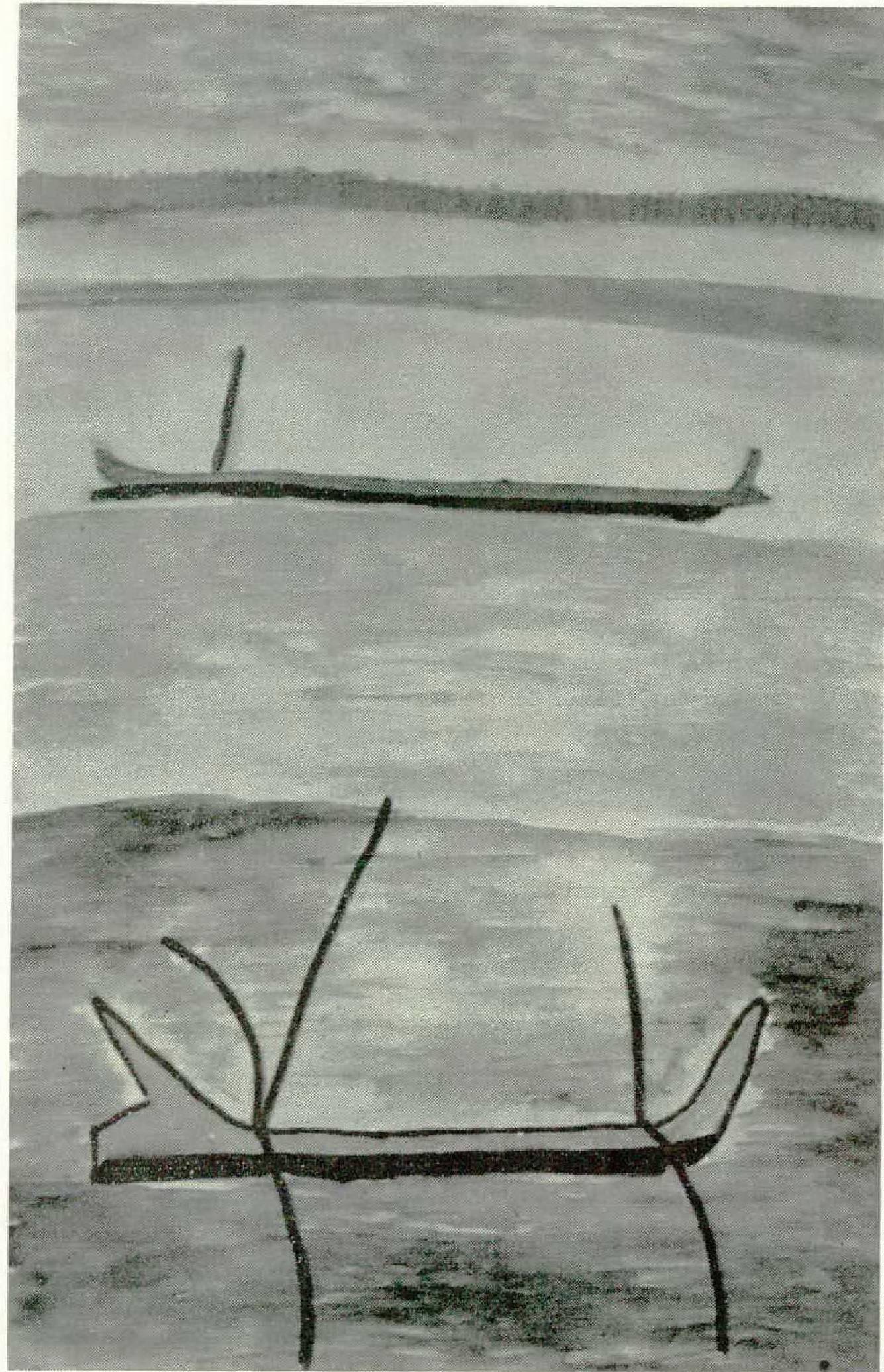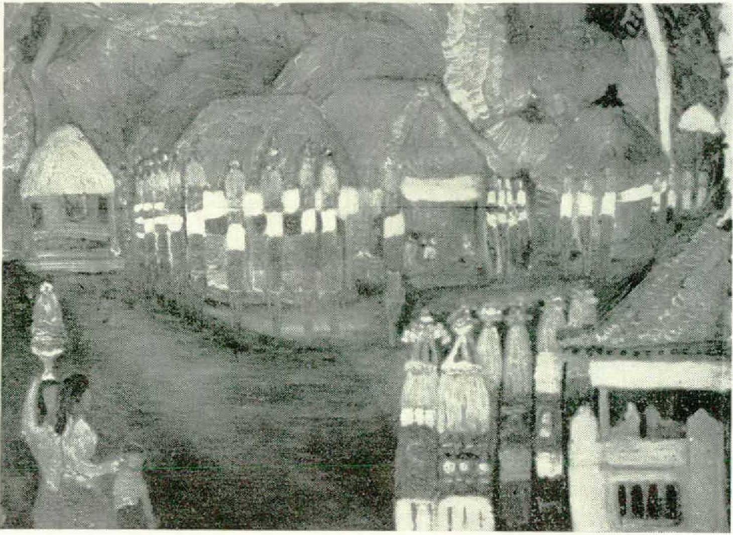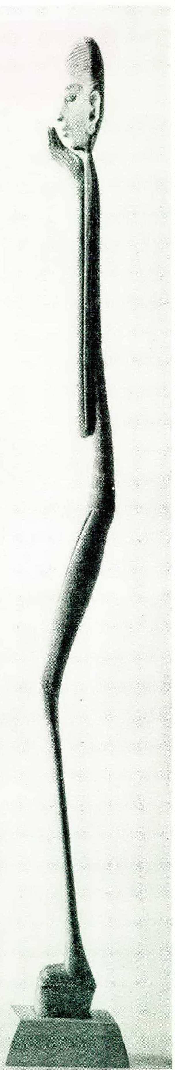 A new, distinct period began in 1945, when the struggle for liberty brought artists into direct contact, with hard realities. There was much selfexamination and exploration of new techniques and new means of expression, some seeking inspiration in the old traditional forms, some adapting European influences (mostly French), some pursuing undefined courses which synthesized a variety of trends. One of the most interest ing experimentalists is O. Effendi, who has moved toward abstraction (Fig. 3), and also has a fine talent for line drawing (see his sketches on pages 98, 107-109). But few would dispute that Indonesia’s most accomplished contemporary painter is Aflandi (born 1910) whose powerful brush work and highly developed sense of color have led European critics to compare him favorably with such expressionists as Kokoschka.