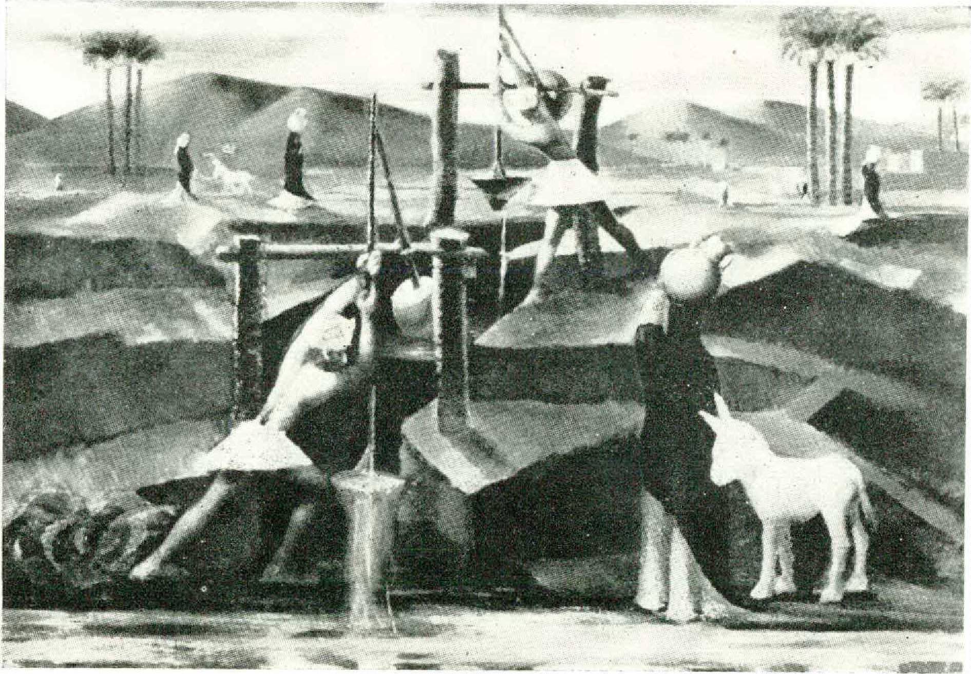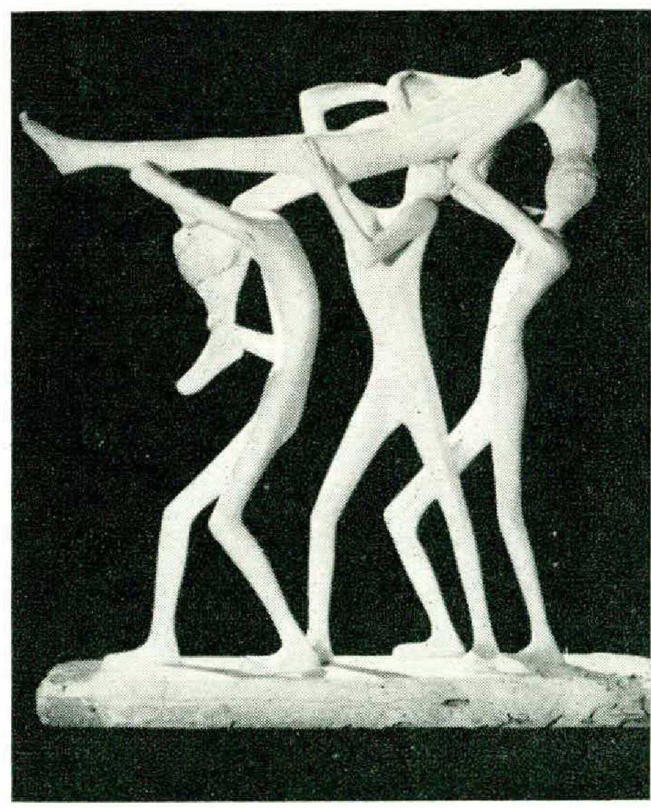 It is in Egypt that the impact of the West has been the greatest, and there are museums of modern art in Cairo and Alexandria. The painter Mahmoud Said, who studied in Europe, and the sculptor Moukhtar were the pioneers of the modern movement, which now includes a dozen or more younger artists of considerable talent working in a variety of schools, all strongly influenced by Europe. Said has painted the Egyptian scene with a deep, romantic affection and vivid color. Hamed Abdalla, a self-taught painter and lithographer, born in 1917 and a spokesman for the younger generation, seeks “to paint nature as I see it with my mind, not as it ‘looks’ to the eye.”His Lovers has been engraved on crystal for the Steuben Glass collection of Asian Artists. Gamal Sagini, who studied in France and Italy and works in many media, is a professor at the Cairo Academy of Fine Arts. The subject of Hagras’ sculpture Fadilah is an ancient one, the carrying of a body to the grave by friends and relatives.