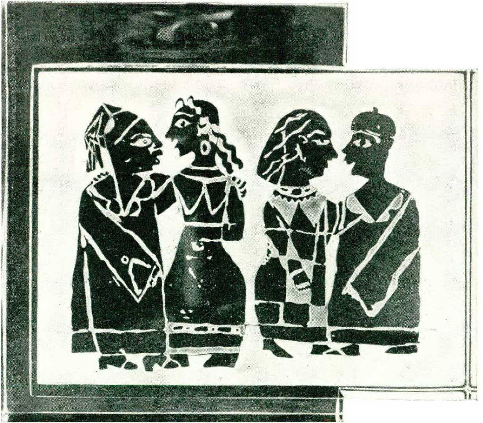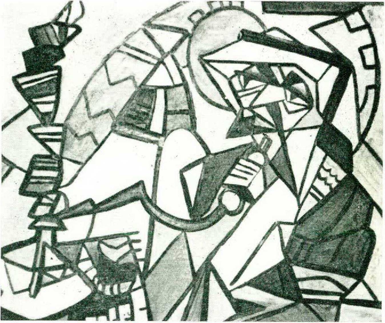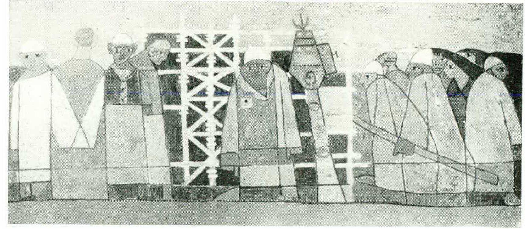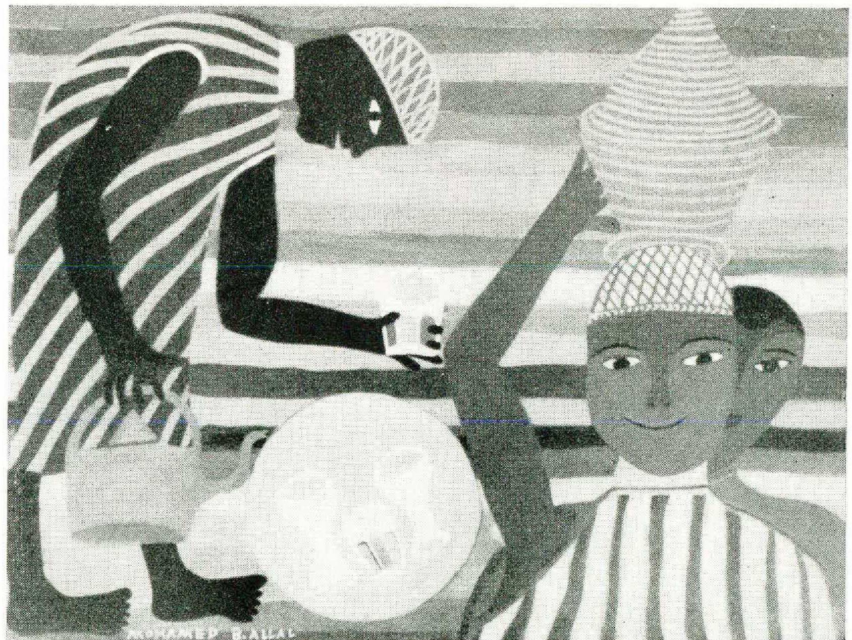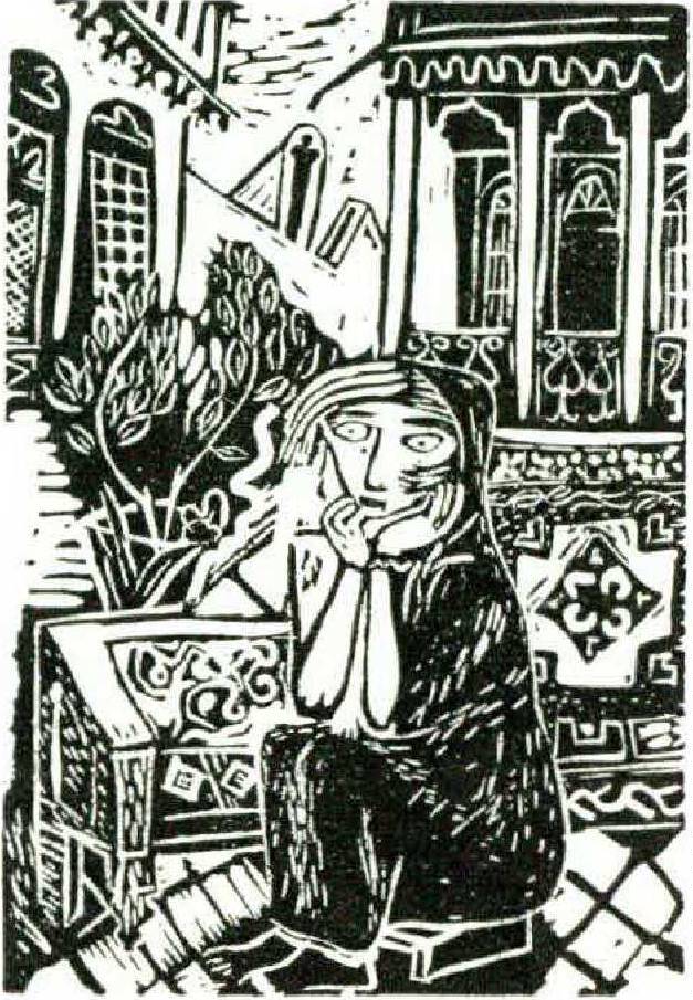 In the 1930’s, the Iraqi Ministry of Education sent five young men abroad to be trained in modern art techniques. Jewad Selim was one of them, Faik Hassan another. They came home painting like Europeans. And when the British sent Polish troops to Iraq during the war, there were among them some artists who further influenced the Iraqis along Western lines, especially toward an impressionistic style. This tendency is still evident in much contemporary work, though Faik Hassan, looking for inspiration to the scenes and customs of his own land and people, has gradually achieved a style of Ins own which is powerful and distinctive. Pat Roy (born 1931) grew up in Baghdad and did commercial art work for an oil company. In 1955 he came to the United States and has been studying and painting at Miami University in Oxford, Ohio. His Blind Minstrel was engraved on crystal for Steuben Glass.