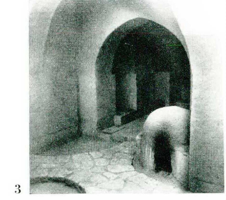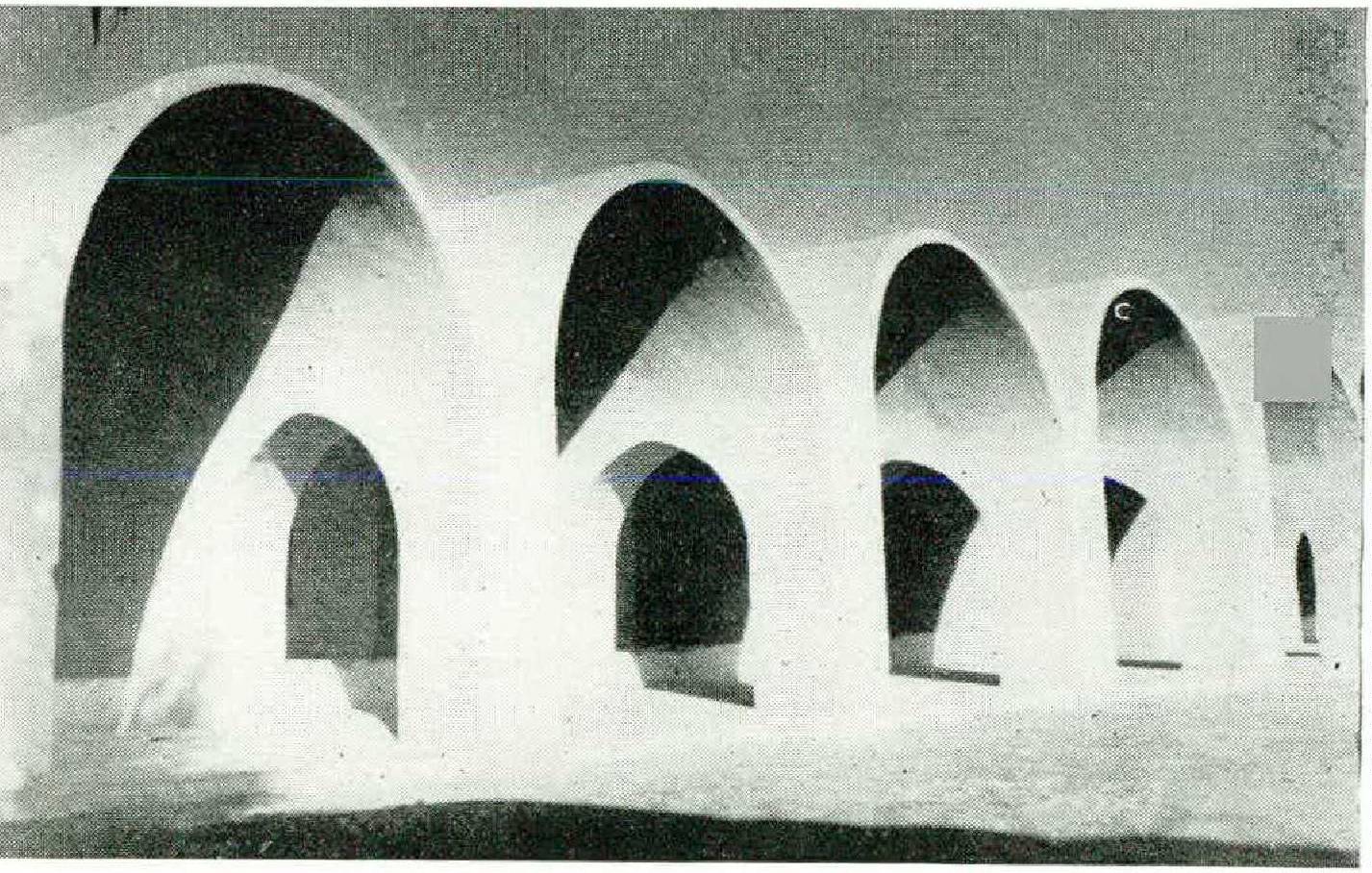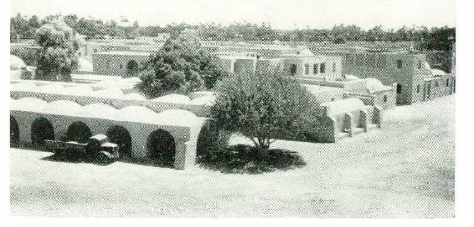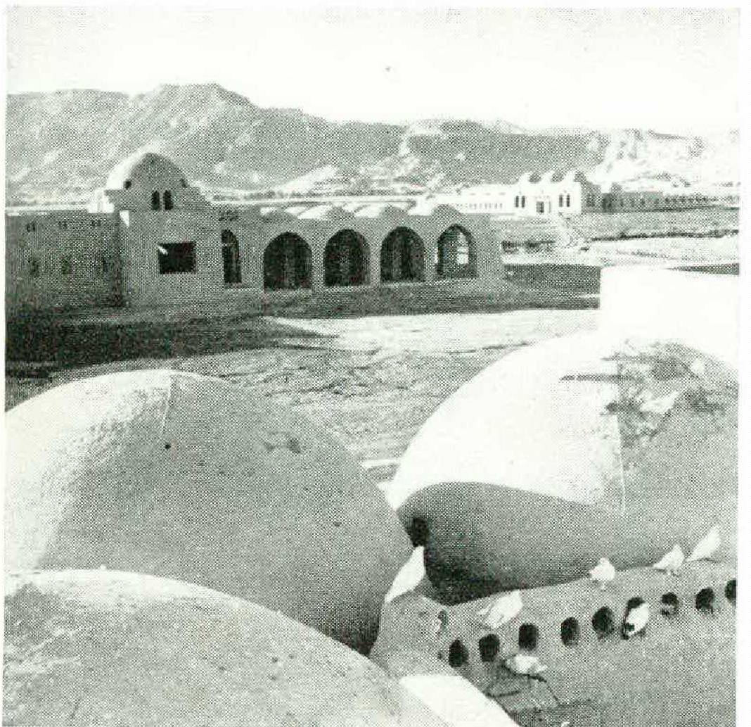 For the now village of Gourna, Hassan Fathi has preserved traditional motifs for decoration and revived some ancient yet still functional structural techniques, such as brick barrel-vault roofs which require no expensive lumber, and, for community buildings, a simple but effective air conditioning system which sucks a draft through a vertical shaft over beds of moistened charcoal. Separate stables for farm animals, covered manure pits, a clean water supply from neighborhood pumps, and proper drainage of waste will improve sanitation. Monotony has been avoided by varying the pattern of adjacent family-group dwellings and using frequent offsets in an irregular streel plan. Some of the Gourna youths trained as masons are already in demand to help reconstruct other nearby villages.