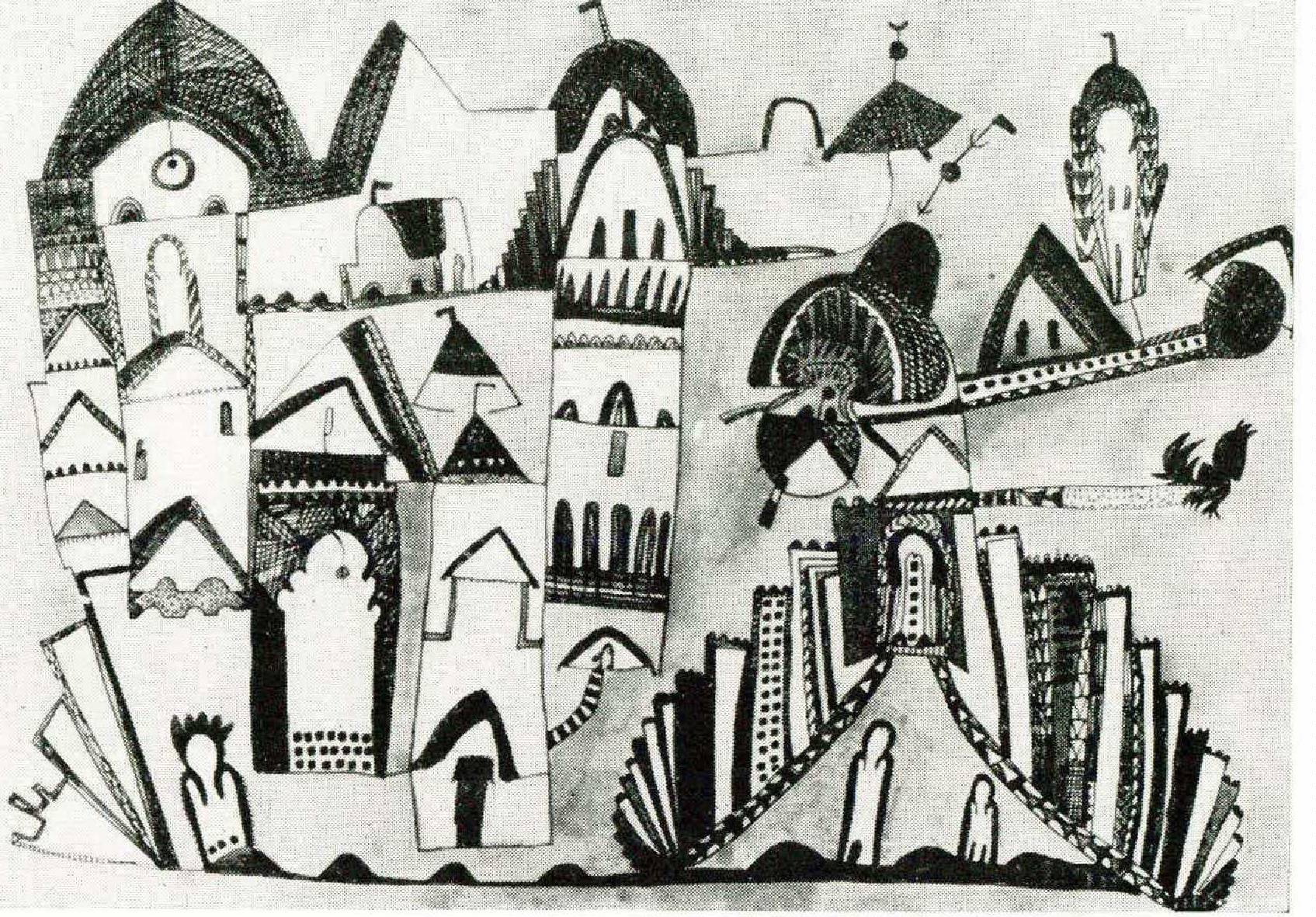 Because Islam did not encourage representations of the human figure, traditional art in the Arab World tended toward the abstract, finding its highest expression in the architecture of mosques and palaces, in the use of intricately patterned, colored tile work for wall decoration, in textiles and ceramics, and in calligraphy, both in tile and books. Thus a Muslim mosque is adorned not with paintings or statues of Mohammed but with beautifully designed patterns incorporating passages from the Koran or other sacred writings. The work of contemporary artists draws somewhat on this religious tradition, but far more on folk art, on the sculpture and tomb paint ing of the pre-Islamic civilizations, and, most of all, on the influence of modern European painting which has entered the Arab World along with technology, the automobile, and the radio. The miniature painting of Persia is much less of an inspiration to young Arab painters today than the work of the French impressionists or Picasso.