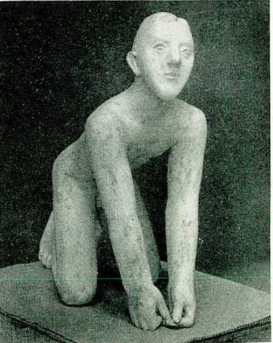 Gerhard Marcks (born in 1889) shows extreme sensitivity, especially in painstakingly formed portraits. Now and then — as in his monument for the victims of the bombing of Hamburg (Plate 24) — he achieves a peculiar, oddly magical form by combining classicism with expressionism. Toni Stadler (born in 1888 in Munich and working there now) responds to the Latin South and draws on paraphrases of Mediterranean, mostly Etruscan sculpture for the vigor of his unmistakably personal poetry. From his sculptures such as Head of a Boy (Plate 17) a lyrical breath issues without straying into pseudo-idyllies.