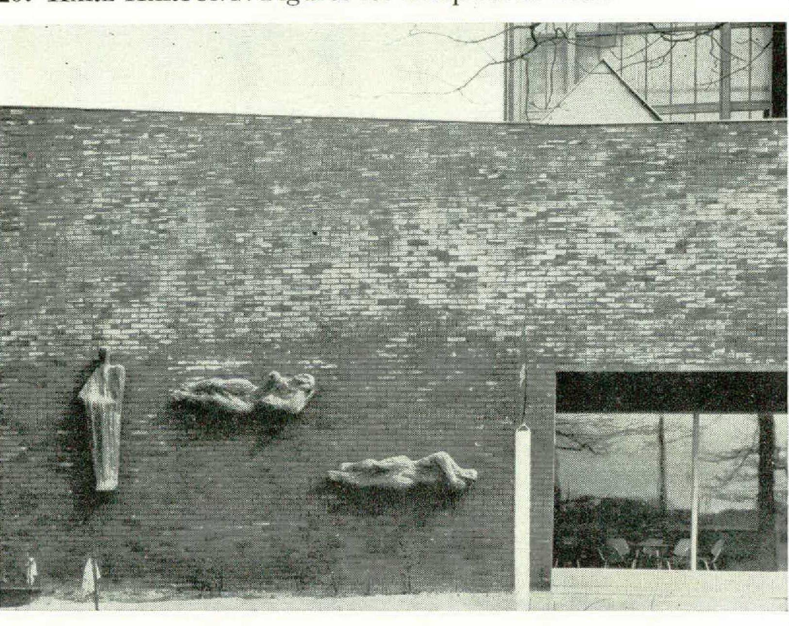 The growing formal power which Bernhard Heiliger (born in 1915, and now professor at the Academy in Berlin) acquired over the years in rubbedstone portraits (Plate 15) has encouraged him to try such great designs as the Symbol of River Navigation (Plate 21) for a new bridge over the Neckar. Karl Hartung (born in 1908, and also a professor at the Berlin Academy) has lately reapproached the problem of the whole figure from the opposite direction: unquestionably the greatest finder of non-objective forms in German sculpture, he wants to use his experience with “free images for the construction of bodies. The group at the gate wall of the hospital in Marl (Plate 20) circumscribes an “absolute” ensemble by means of seemingly natural bodies. As in recent painting, this road also leads to a new kind of reality. Hans Uhlmann (born in 1900, another professor at the Berlin Academy) realizes brittle and sometimes vibrant metal constructions (Plate 16). Rolf Nesch (born in 1893), an emigré in Norway, has gone from metal printing refinements to a highly original mixture of graphic art and relief sculpture (enamel-inlaid copper; Plate 19).