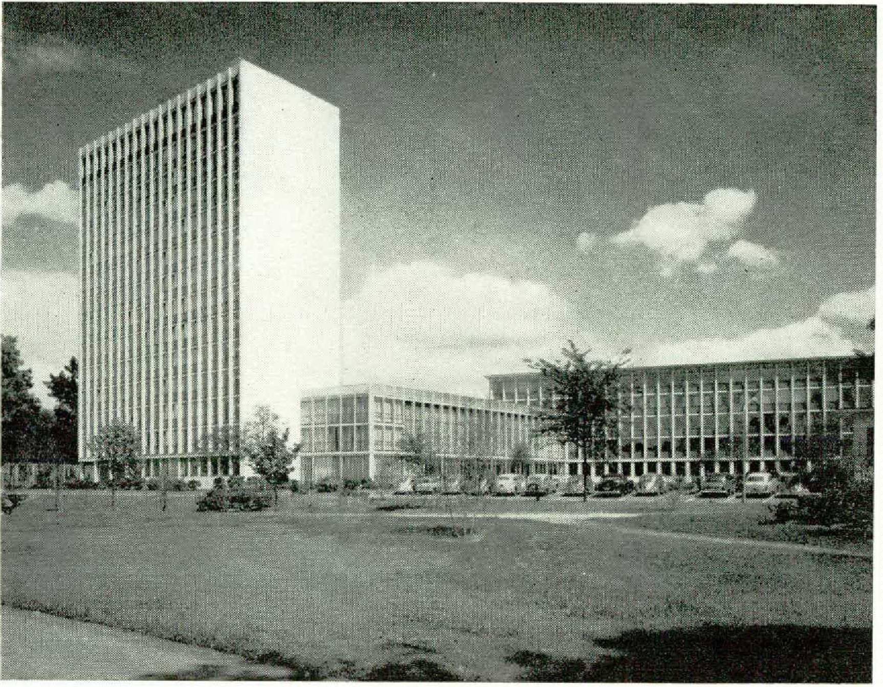 Accordingly, when reconstruction of the destroyed German cities and towns began about 1948, there was no dearth of technical specialists, but rather of the designing artists who had once given German architecture its truly world-wide importance. Considering this emigration of productive minds, and considering further how largely reconstruction depended on the existing underground utility and sewage systems, how greatly it was hampered by the chaos in real estate, how much could and had to be improvised for the time being — considering all this, we can grant all justified complaints of missed opportunities and yet marvel slightly that despite these paralyzing difficulties a good measure of architectural inventiveness could prevail in the welter of postwar building.
