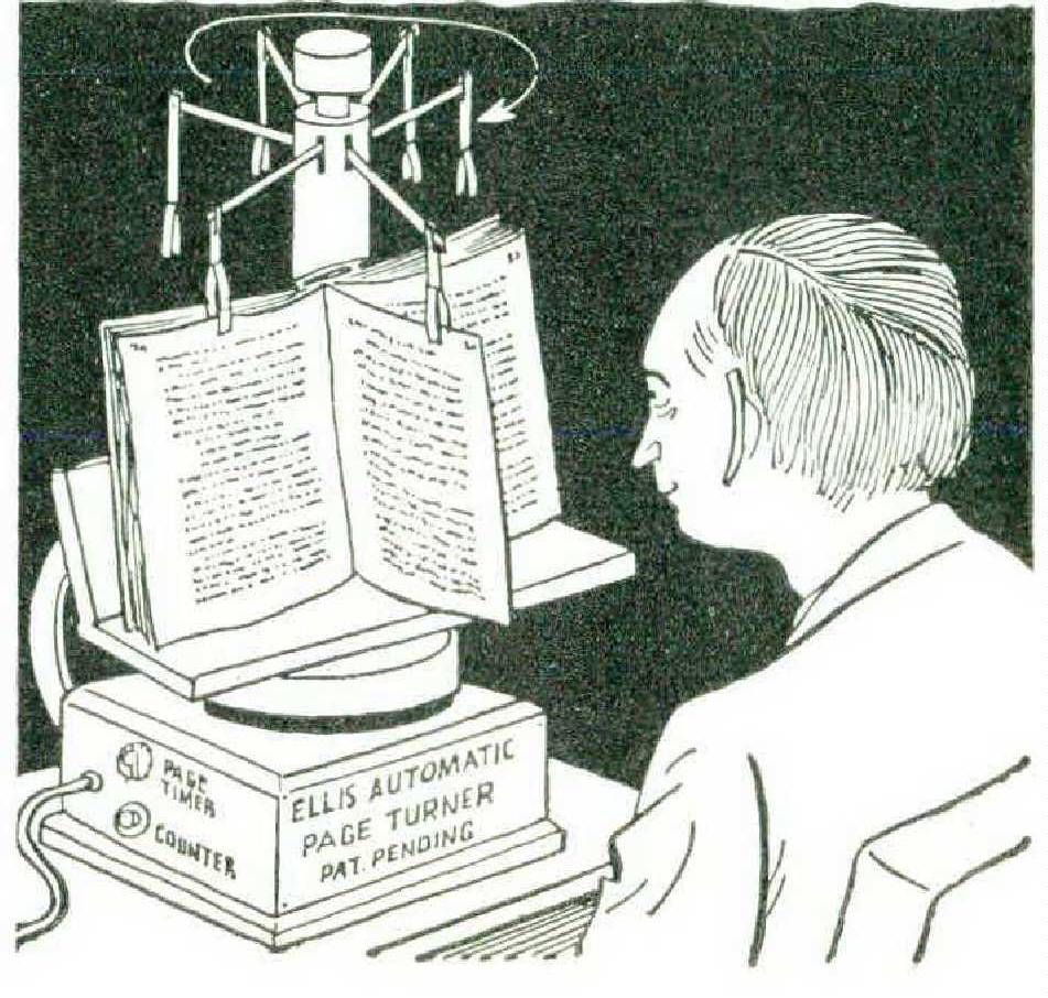 A secondary problem, not much likely to bother the reader of this article but capable of seriously holding up a man trying to get through a rice-paper edition of the Bible before bedtime, is the purely mechanical difficulty of turning the pages last enough. Time wasted in leaf manipulation can undo much of the advantage gained by the avoidance of unnecessary eye movements, and there does seem to be a need for some kind of device (perhaps an attachment to the shutter?) that would perform this tedious office — at a predetermined rate, of course. If it could be made to do the actual reading as well, so much the better. The reader would then be free simply to repeat nonsense phrases to himself, undistracted by the written word.