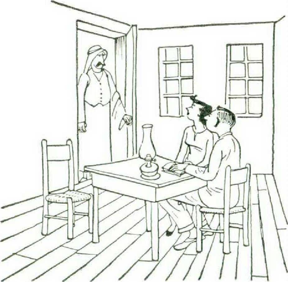 Crops ripened and the summer became hot, even at our four-thousand-foot altitude. My beard, which I let grow, turned out an unbecoming red and was removed. Sitt Mary cooked and washed and read and took walks and complained far less often than she felt like doing. Our next-door neighbor, a crazed old man who ten years before had been retired from the job of village muezzin, shouted the call to prayer from his roof, right over our courtyard, every morning at first light, between three and four o’clock, and it always took us some time to get back to sleep. The sayid’s knock would come at our back door every morning at exactly nine and every afternoon at exactly four, bringing us out of books and back to Juml, Our tutoring sessions were not wholly successful; for an hour or so the sayid could be kept on dictations or corrections of my halting reading of the Koran, but his attention span was short, and he would soon in spirit have left our magnificent living room and be in one of the open-air coffeehouses. His restlessness would communicate itself to me, and I would soon suggest a trip downtown, or sometimes a walk with Maddie to a particularly green spot of garden on the hillside. In the coffeehouses, under temporary sunshades rigged from tree branches, the young men would be congregated, mustachioed and double-breasted to a man and infinitely sophisticated and world weary. Arab young men (shabab) are a class in themselves, combining the functions of clubmen, debutants, drugstore cowboys, and anarchist cells. Sometimes we would play cards, elementary games involving huge scores kept on slates.