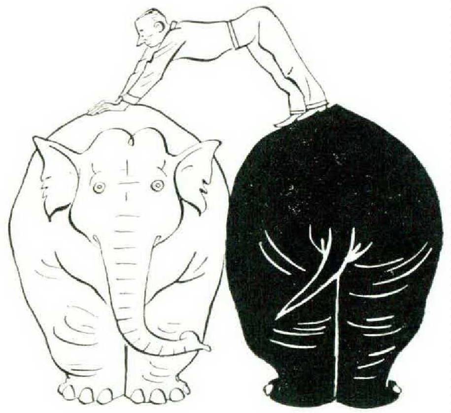 We may, though, fall into even greater error if we confuse the improbability of subjective elephants with the nonexistence of subjective elephants. The existence of subjective elephants is no more open to doubt than it is susceptible of proof. I have myself encountered no less than four subjective elephants at one and the same time. This interesting experience took place one autumn night in 1952, at about 3 A.VL, in Leicester. I was driving north in a Morris Minor. In the center of the town, which appeared otherwise deserted at that hour, four elephants appeared, in profile, at the righthand side of the road. There was a very large elephant at the rear, with his hindquarters up against a house, an elephant of normal size standing slightly in front of the first, a small elephant standing similarly ahead of the second, and a tiny elephant in front of them all.