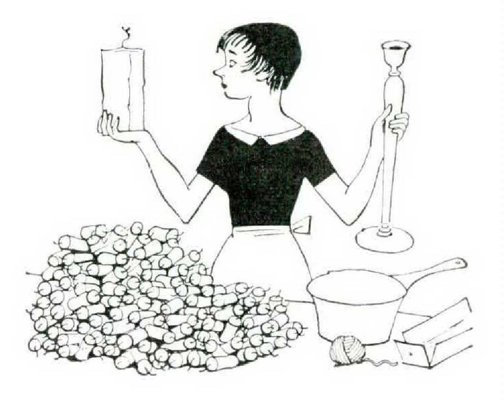 Then one day, after reading a jolly little article on homemade Christmas gifts, I decided to do something. According to the article I could use up great quantities of old candles at one fell swoop. I collected all the candles from all the drawers, cupboards, and old Christmas gift boxes — even found a few in an old Ming vase (pronounced “vahs”). Reading directions, I got out a pan, several old quart milk cartons, and a piece of string (which, thank goodness, I am not a saver of), and went to work.