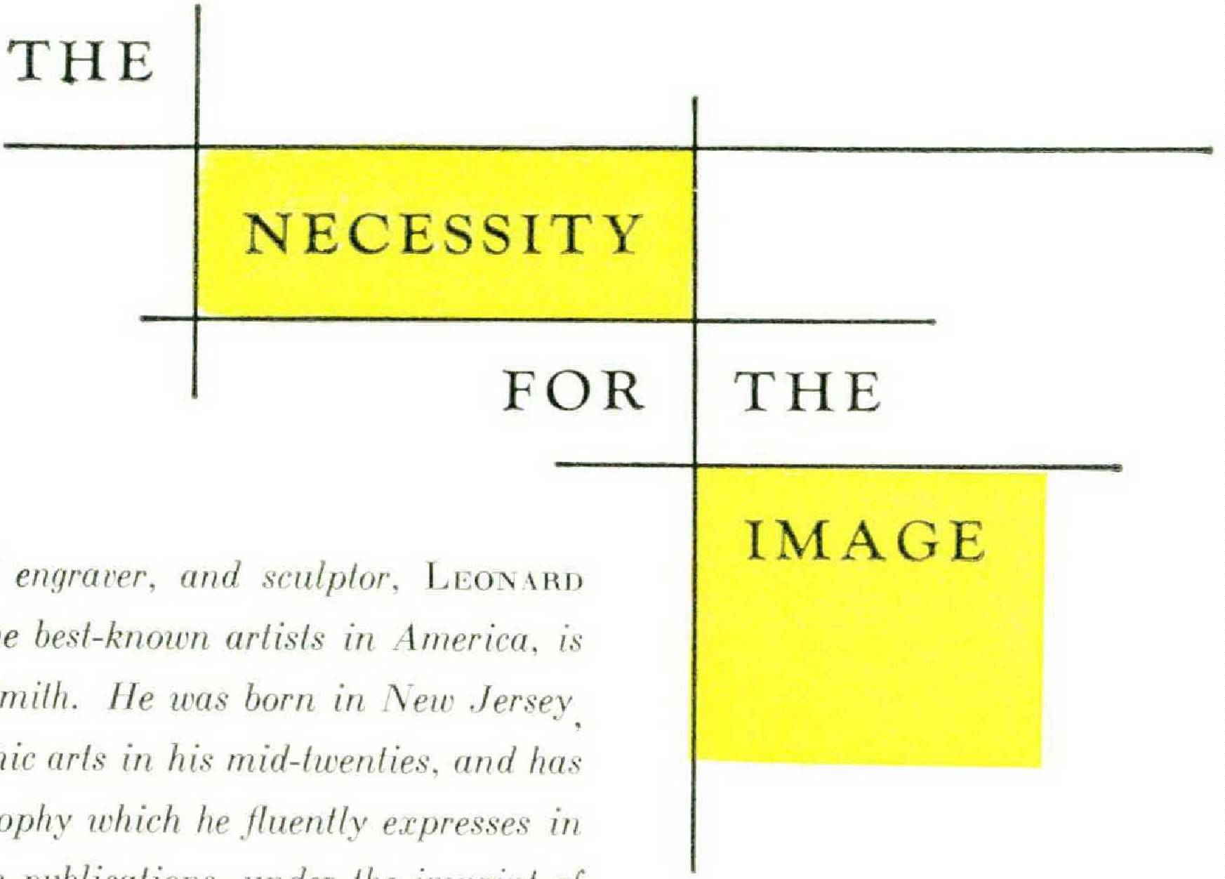 Draftsman, wood engraver, and sculptor, LEONARD BASKIN, one of the best-known artists in America,is now teaching at Smith. He was born in New Jersey, turned to the graphic arts in his mid-twenties, and has developed a philosophy which he fluently expresses in his lectures,in his publications,under the imprint of the Gehenna Press, and in his works of art.