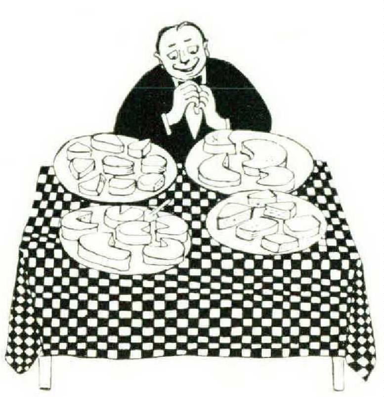 We begin with the soft pastes: Grand Yatel, Suprème, Fin de Siècle, Brillat-Savarin, Trois Épis, Lucullus (78 per cent fat content). And now for the Roblochon, the Echourgnac, the Murol, and let’s not miss the Vacherin d’Abondanee over there. . . . Easy on that Brie, because here’s Number Four coming up with the Coulommiers and the Monsieur Fromagc for openers, and after that there’ll be the Goats, and after them, the Blues and the Swiss.