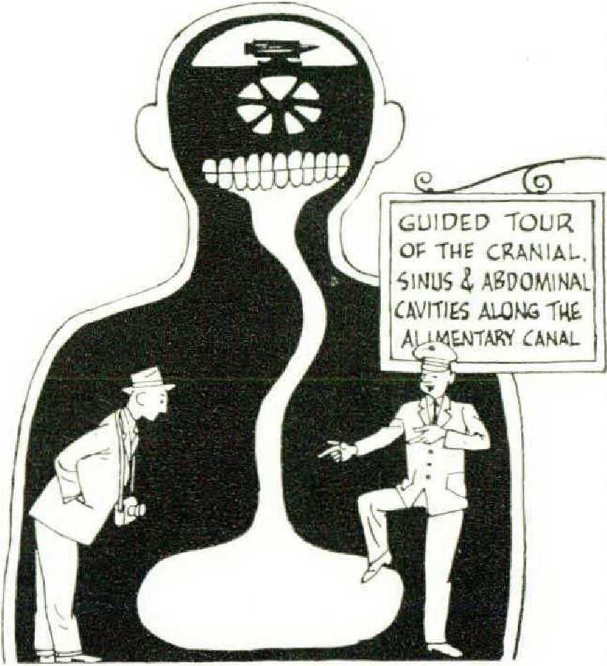 THE STOMACH: The stomach is a transparent glass globe which resembles a goldfish bowl. It is half filled with stomach acid, the supply of which is maintained by a perpetual leak in the roof. It is in our stomachs that A’s and B’s look for a way out — and small wonder.