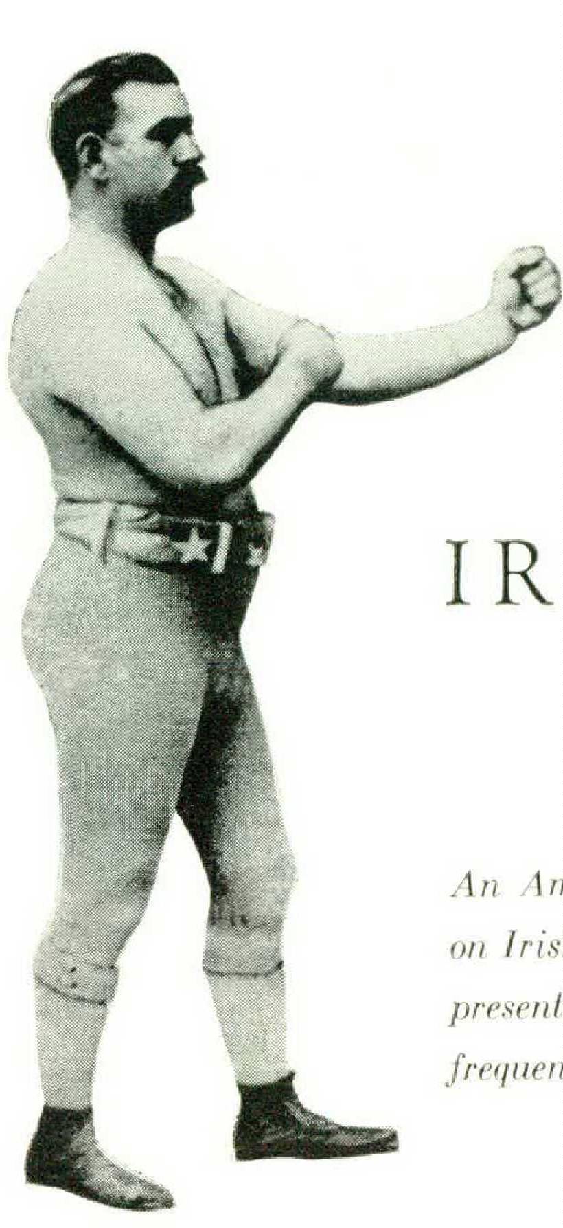 Nonetheless, the heroic age was a fact. Heroic qualities characterized it: not least, the unconsidering wastefulness of men who felt they had nothing for which to save. Then every Irish quarter had its strong man, who would lift a dumpcart on his back or bend a crowbar, and who ruptured himself or died of booze, and who in my childhood might dimly be remembered as the “sort of idiot” that used to be around in those primeval times. That was what Sullivan superbly and prodigiously embodied. The dumpcart lifters had the strength of two or three . . . Yankees, let us say, but they were poor. Sullivan displayed the strength of ten for purposes impartially pure or impure, lavished his money like a pagan king, drank like a whole bevy of royalty, and with iron pugnacity and iron confidence bade defiance to the world that undervalued the Irish. He was only eight years older than Corbett, but they stood on either side of a gulf of history neither experience nor imagination could bridge. Ten years after his defeat, his people were already forgetting what he had meant. They had begun to refer to him as a figure of fun. And that was the last thing the real John L. ever was.