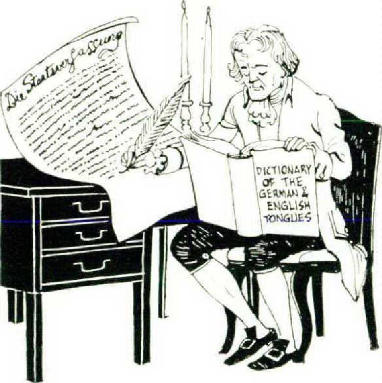 There, in the appendix of the book, was the Constitution of the United States in German. I had never seen it in German, nor in any language but English, before, and was very much impressed by Herr Dr. Zimmermann’s thoughtful, beautiful version. The official translation, which I had never even thought about before, would certainly be somewhere else, somewhere more accessible, but since I had it there, I copied Dr. Zimmermann’s Preamble: