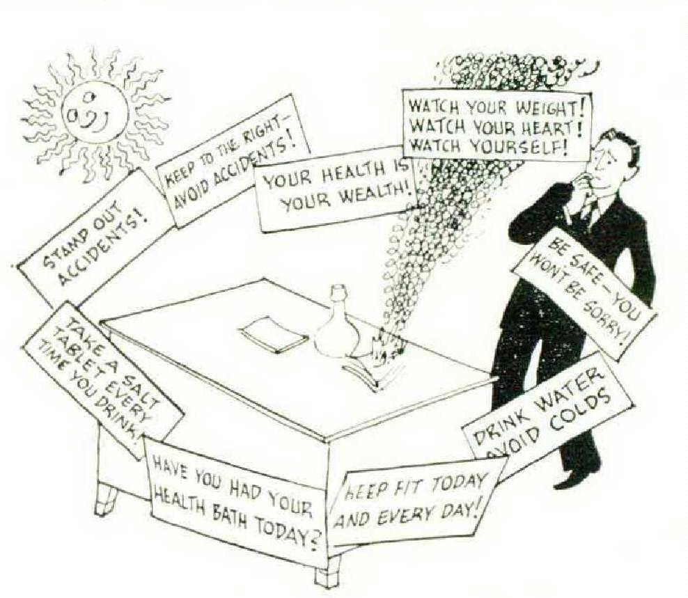 AVOID EXCESSIVE PERSPIRATION AND THE ATTENDANT DANGER OF HEAT EXHAUSTION. TAKE A SALT TABLET EVERY TIME YOU TAKE A DRINK.
