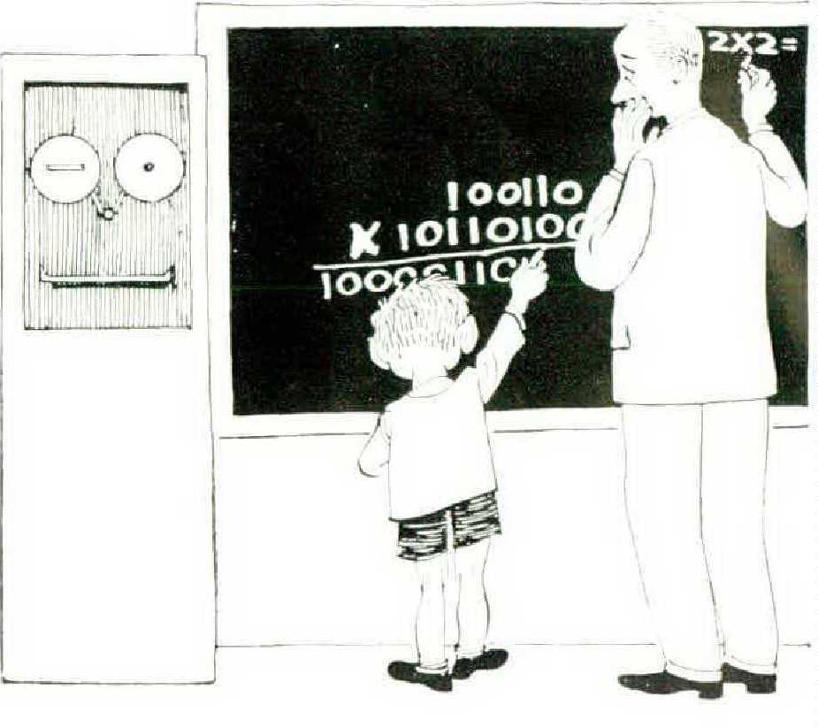 That 1111. as you have seen, is 1 5 in computcrland. This kind of arithmetic is called binary, and any child could master it in a jiffy if his mind weren’t cluttered with the old-fashioned kind. Why should we let machines. but not schoolchildren, get away with such easy figuring? Some smart kids are beginning to wonder. But this isn’t the only embarrassing question that teachers soon will have to face. The machines are being permitted to read and write without first learning to draw an A, B, or G.