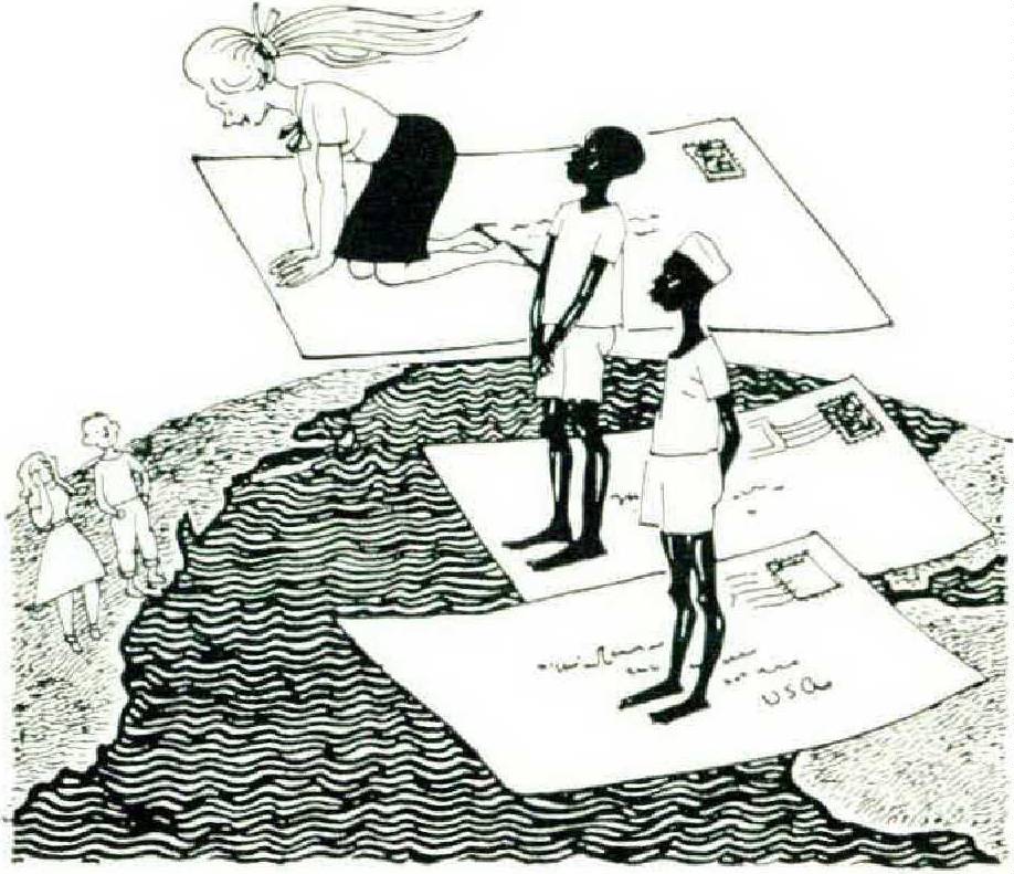 So off went M. with her babysitting dollars and bought three Tshirts, at a bargain. There are no bargains in the U.S. post office. Airmail would have cost about seven dollars, so the shirts left by slow boat to Africa for a little less than three dollars. But eventually they arrived, because a thank-you letter came in which M. Raba said he liked the shirts very much, he had a birthday in two months, and he also liked sport shirts, size medium.