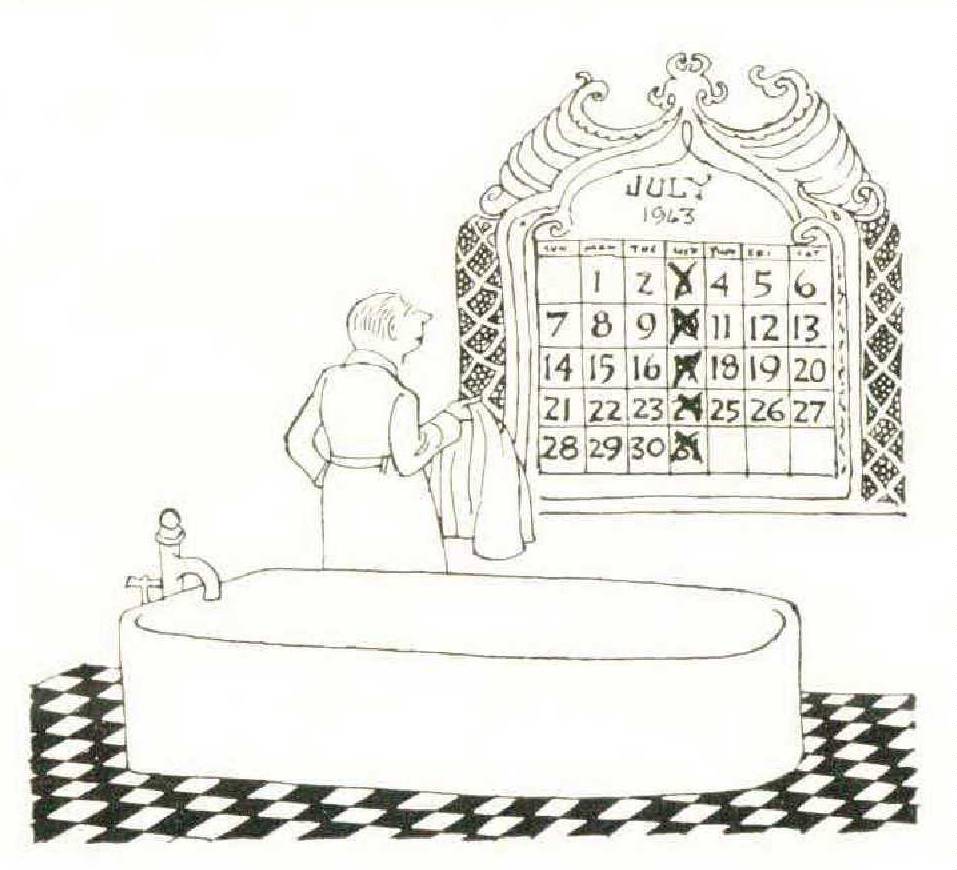 I went to bed Wednesday at midnight and slept like a baby, slept until noon the next day. Some weeks later, after a series of these abstinent Wednesdays, I was saying goodbye to my friend the barber, whom I had continued to visit for consolation. I thanked him for all his kind offices to my temples and shins. “You have been a good patient,” he said. “You don’t bathe too much on Wednesday.”