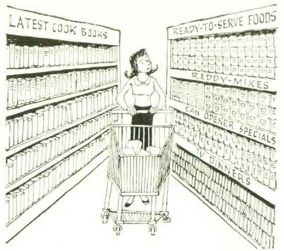 With cookbook tonnage at its peak, we might be tempted to concede victory to the publishers — until, that is, we browse through the supermarket. Then it becomes evident that food packagers are matching book lists ton for ton. Shelves and freezers are stacked with frozen, desiccated, canned, ready-mixed, aerosoled, partly baked, quick, or instant, entrées, hors d’oeuvres, soups, desserts, beverages, sauces, and baked goods which require no reading of recipes beyond a glance at the directions on the label.