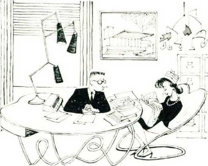 The young client is usually a half hour late for her appointment. She is dressed in that cocktail-hour, allpurpose black and the right jewelry for 5:00 P.M., even though it is only 10:00 A.M., and smells to high heaven of expensive behind-the-ear stuff. She snilfs at the cute secretary borrowed for the morning to make the office look prosperous. The secretary gives the boss an immodest wink and swishes out, banging the door. Well, this is it. The hardened, moneygrubbing lady of the house versus the airy, aesthetic, cultured spendthrift, the architect.