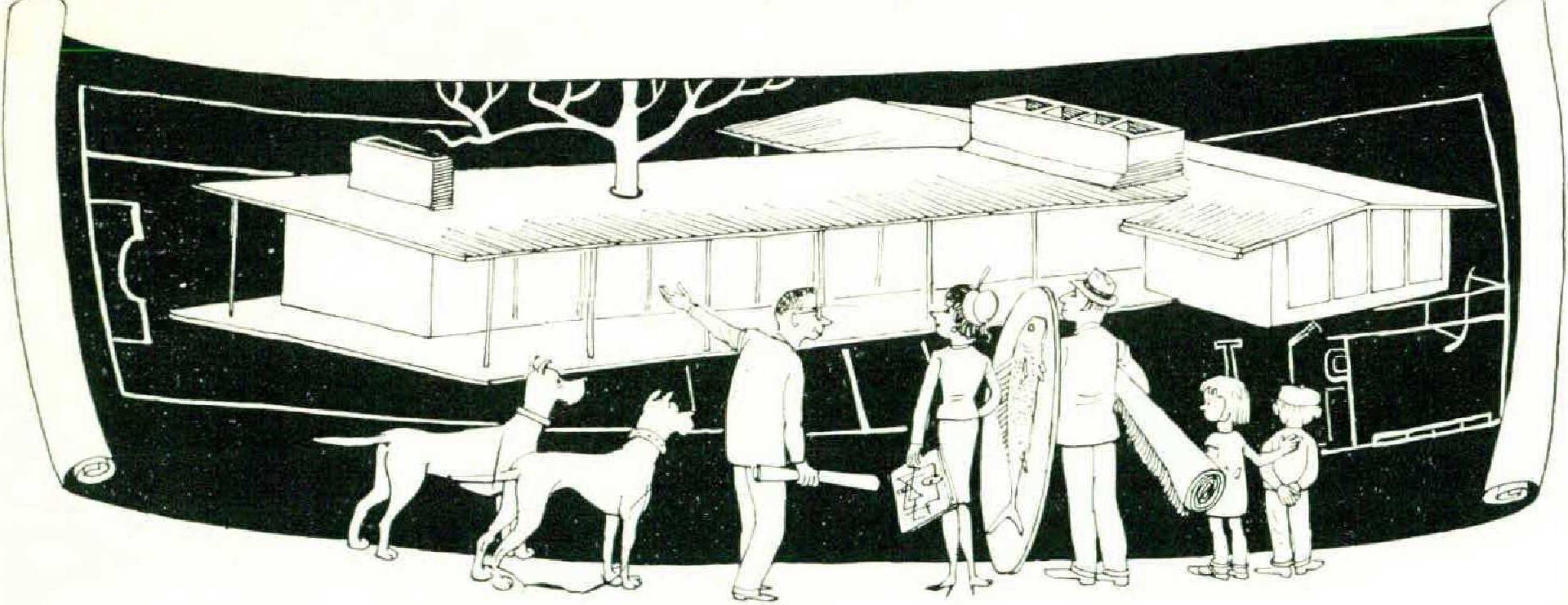 Again the architect sits back and checks it off. He has heard it all before. Her husband wants an indoor-outdoor one-story house, a patio with an outdoor grill for cooking steaks, a swimming pool, a television and radio in every room, air conditioning, and a small room lor his home movies and bridge games, with a fireplace and a mantel for his golf trophies and a space for the tarpon he caught off Miami. He thinks her parents would be happier in a city apartment; his parents should live in Florida and fish; and it is time the children were in boarding school. Old Katie, the family retainer, should be pensioned and sent home; and a modern house could easily have a couple of Great Danes wandering in and out.