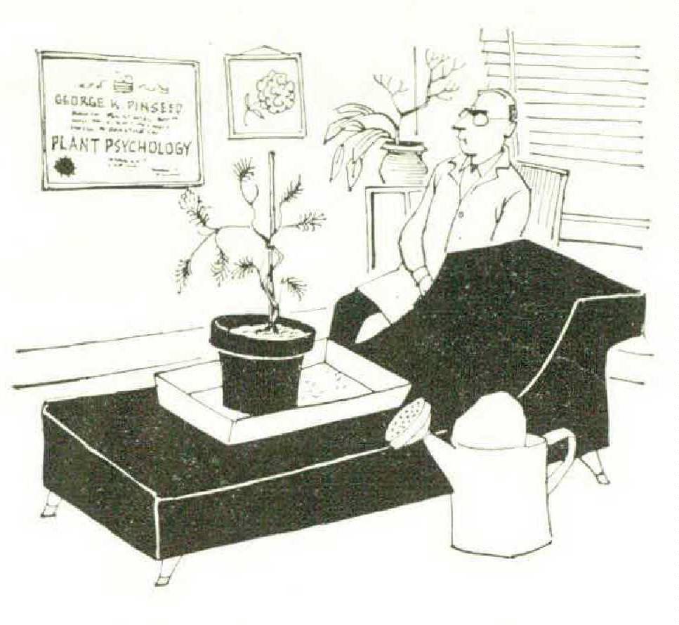 This espaliered candytuft of mine really is neurotic, and no wonder. As you may or may not know, to “espalier” is to train a plant to do something it doesn’t really want to do, like climbing up a U-shaped scaffold on the side of a house. It is accomplished by means of much coaxing and twisting and tying and pinching and pruning. My book describes it as an educational, rather than a corrective, procedure; and the fact that candytuft isn’t included in its list of likely students was only a challenge to me. I was determined to teach my candytuft to climb a stick. “We’ll see who’s boss around here,” I had snarled. This was several years ago; and although the head of the candytuft has now reached the top of the stick, it has by no means conceded the victory to me. If it wasn’t for my constant vigilance, it would have become a dropout long since. The minute my back is turned, it starts to put out side shoots; and if any of the ties that secure it to the stick relax their hold, it slumps to the ground in a dejected little heap. Its few remaining leaves turn yellow, and its blossoms are meager and sporadic, in spite of the expensive delicacies I lavish on it. This clearly indicates a psychosomatic rather than a pathologic syndrome.