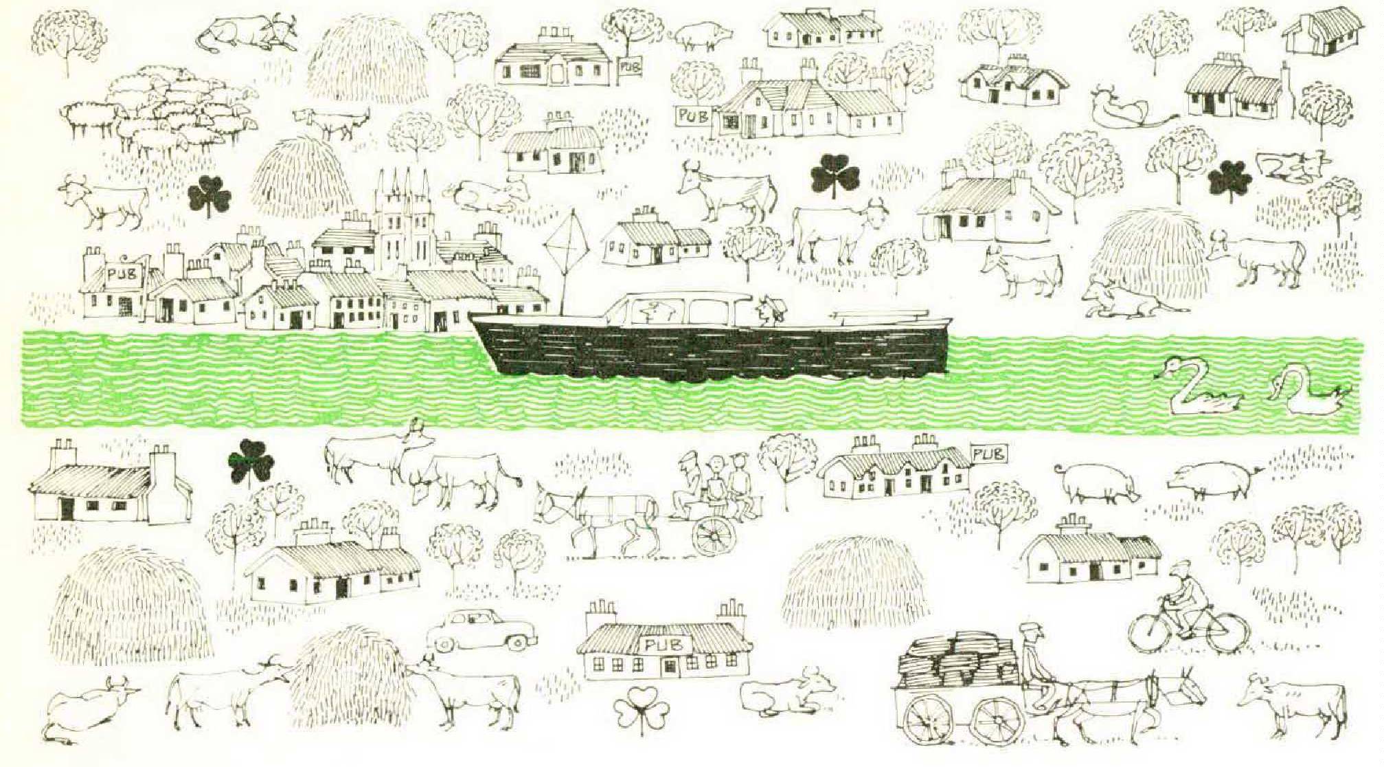 But all is not early Victorian. Extraordinary towers rise in the distance: they are the Electricity Supply Board’s new generating stations that produce power from milled peat. And as we sailed through the bogs, we watched the peat-cutting machines, orange monsters that scrape a thin layer from the top of the bog, leaving behind them vast red-brown areas exposed to the sky. Making electricity from peat is one of those typically Hibernian combinations of old and new; it accounts for the latest Irish phenomenon, ancient cottages with television aerials sprouting from their thatched roofs.