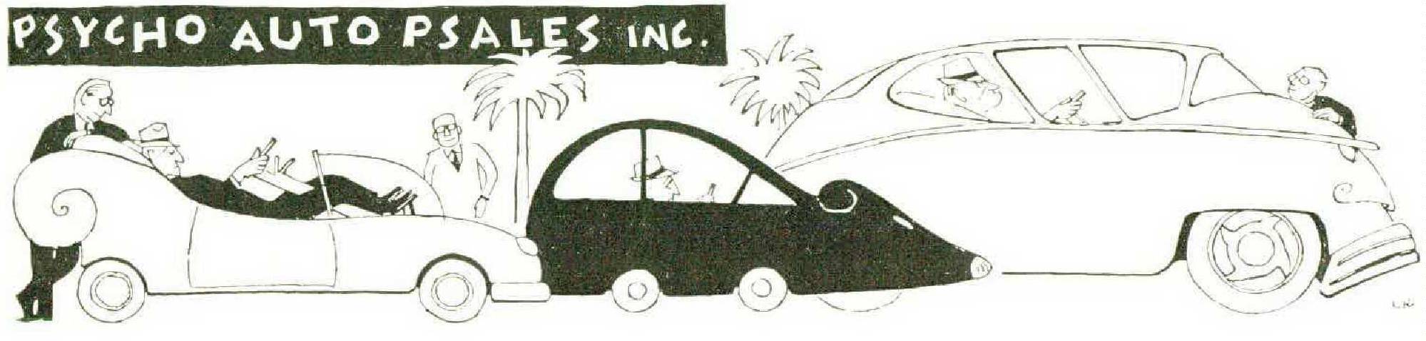First-place winner in this year’s Humble Economy Run is Freud’s dependable, modestly priced compact, the Superego, respected everywhere for its purity of design, clean lines, rigid construction, and structural integrity. You’ll always enjoy perfect control with the Superego’s original austeering wheel, oversized self-adjusting brakes, tension-action stabilizer bar, and high-repressionratio engine. The interior, tastefully done in virgin vinyl and stainless steel, features upright seating upholstered in sturdy moral fiber, and a halo-lighted instrument panel. Available in several models: Model Wife, Model Husband, Model Son, and Model Citizen. The Superego will suit your compulsive drive to perfection.