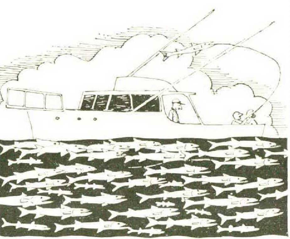 By the time he released it, his blue jeans were so fishy I could stand it no longer. I made him change, took the offending pants, rigged a washing line, and threw them overboard, hoping to soak off some of the offending smell. Immediately, a six-foot cuda appeared, circling slowly and hungrily beneath them. After that, baths were no longer taken over the side but on deck with buckets of seawater sloshed over the victim.