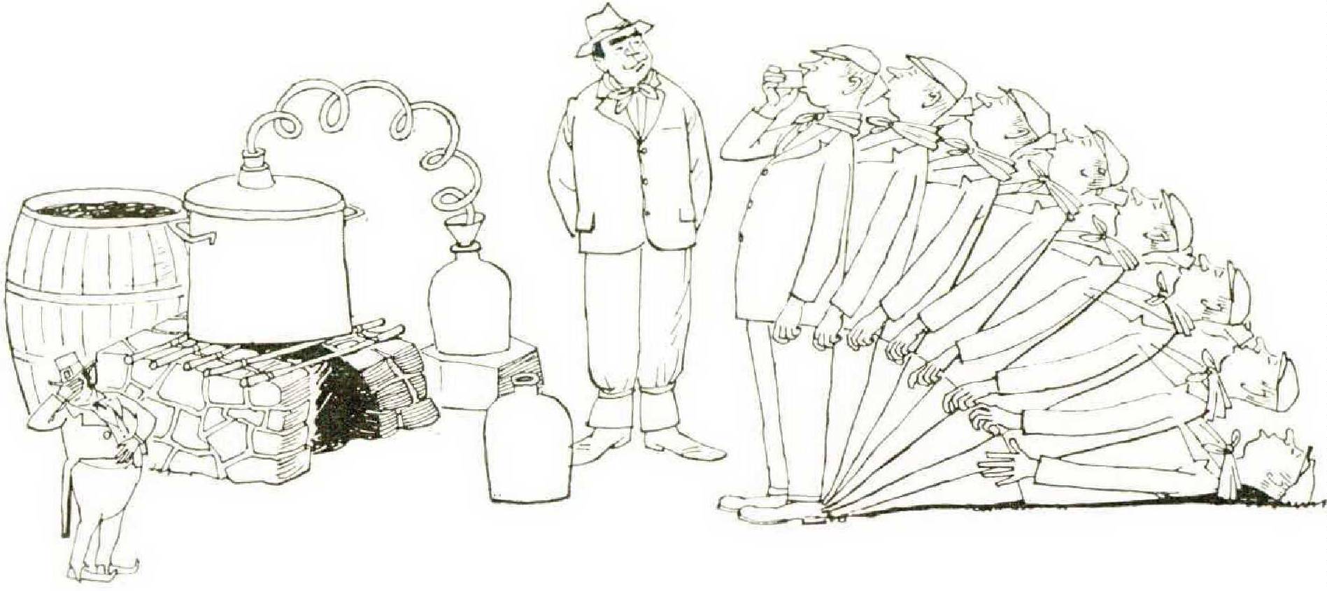 Potheen is dying a natural death, and today the wisps of smoke over the Slievefelim no longer draw the now motorized Gardai from their barracks. For they probably do no more than mark the hearths of cottages or the work of an assiduous farmer, burning old grass along the side of a lane. The old folk who used to make merry in the mountains are vanishing, and their grandsons prefer to turn up at the village dance halls, scrubbed, rosy-cheeked, and dressed in the standard, serviceable blue suit. One may lament the disappearance of the mystery and the Carbonari atmosphere of conspiracy which potheen created — but one must remember that it always tasted terrible.
