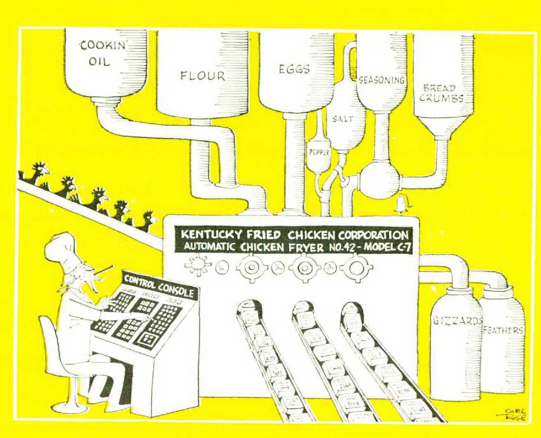 While the revolution in television is still in the making, I cannot help wondering what expectation is causing hundreds or thousands of investors to dream great dreams about Kentucky fried chicken, dreams sufficient to gain support upwards of $6 million for an enterprise based on that commodity. What sort of developments would set Wall Street buzzing about fried chicken? The investment counselor, the financial editor, the broker’s letter—what would they be remarking in the friedchicken world, near term or long pull, that might lead to an upward movement of 10 or 15 points? True, there might be an intracompany struggle for control that would run the price up. There was the rich mineral deposit that the Curtis Publishing Company happened to find on its timberland in Canada, and something like this could very well befall the fried-chicken people — an oil strike under the incubator area or perhaps gold itself just outside the fry house. There is always the possibility, too, that a huge company in search of diversification might ask itself, “How come we have never gone into fried chicken?” and a takeover could follow at a fancy figure.
