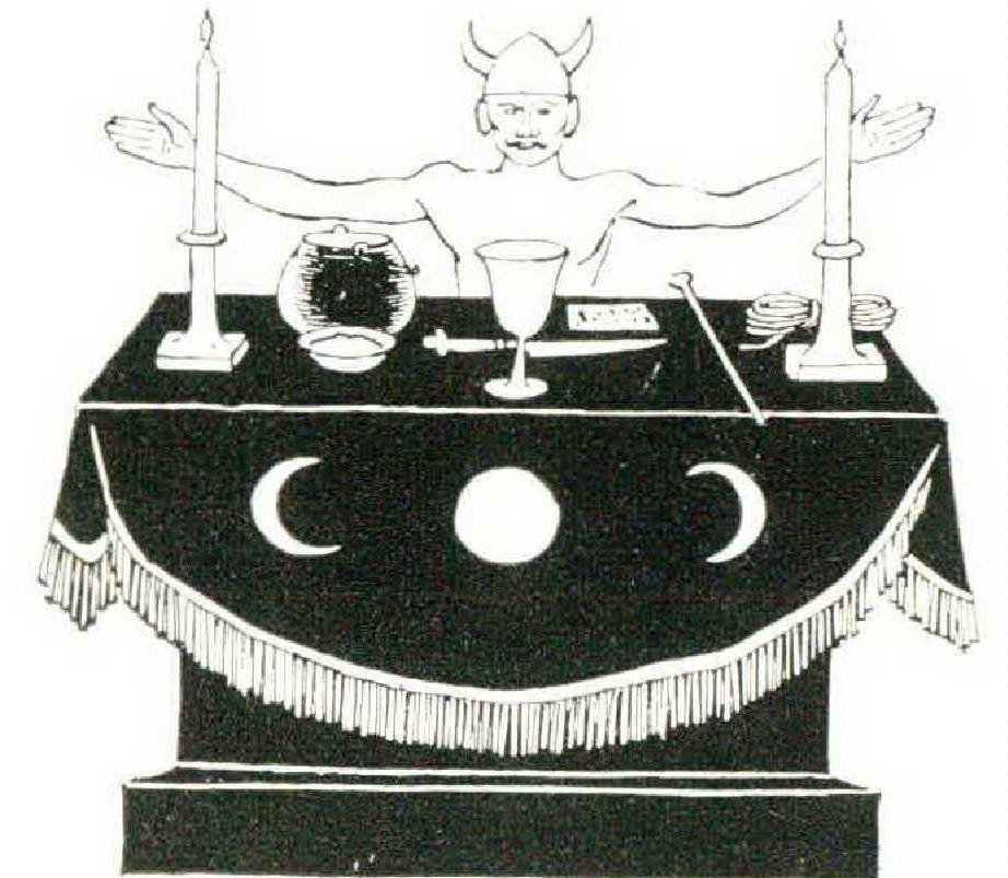 All members of the coven are naked and wear a garter, really their white initiation string, around their waist. The priestess has three, signifying the material, mental, and spiritual aspects of life. The women wear necklaces, which can be made of pearls, metal, glass beads, and so on. The necklace is a circle, and therefore another symbol of eternity. The priestess wears a special silver bracelet on her arm (silver is the color of the moon) engraved with symbols and her witch name. There is an altar on which are placed various tools of the craft: a silver chalice, candles (which in this coven are not black but usually a color suitable to the time of year, such as green for May Eve), a wand generally made from hazelwood, a small caldron, a censer filled with incense, a pentacle which is a flat piece of metal engraved with witch signs, a length of cord, a scourge, a bowl filled with salt, and the black-handled athame. Each tool has a special meaning. The caldron represents water and the Mother Goddess; the wand is the male phallus and fire; both salt and the scourge symbolize purification; the pentacle is earth; the athame is air; and the cord is the spirit that unites all elements.