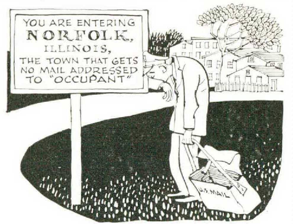 The people of Norfolk, Illinois, were never especially fond of receiving mail addressed to “occupant,” even though it might tell how to order custom-made draperies at below factory prices, or contain a coupon good for seven cents off on a kitchen item that wiped clean with a damp cloth. No one thought such mail was important. But then last year the entire community of 20,000 was deprived of its rightful quota of such mail. The repercussions have not yet died away.