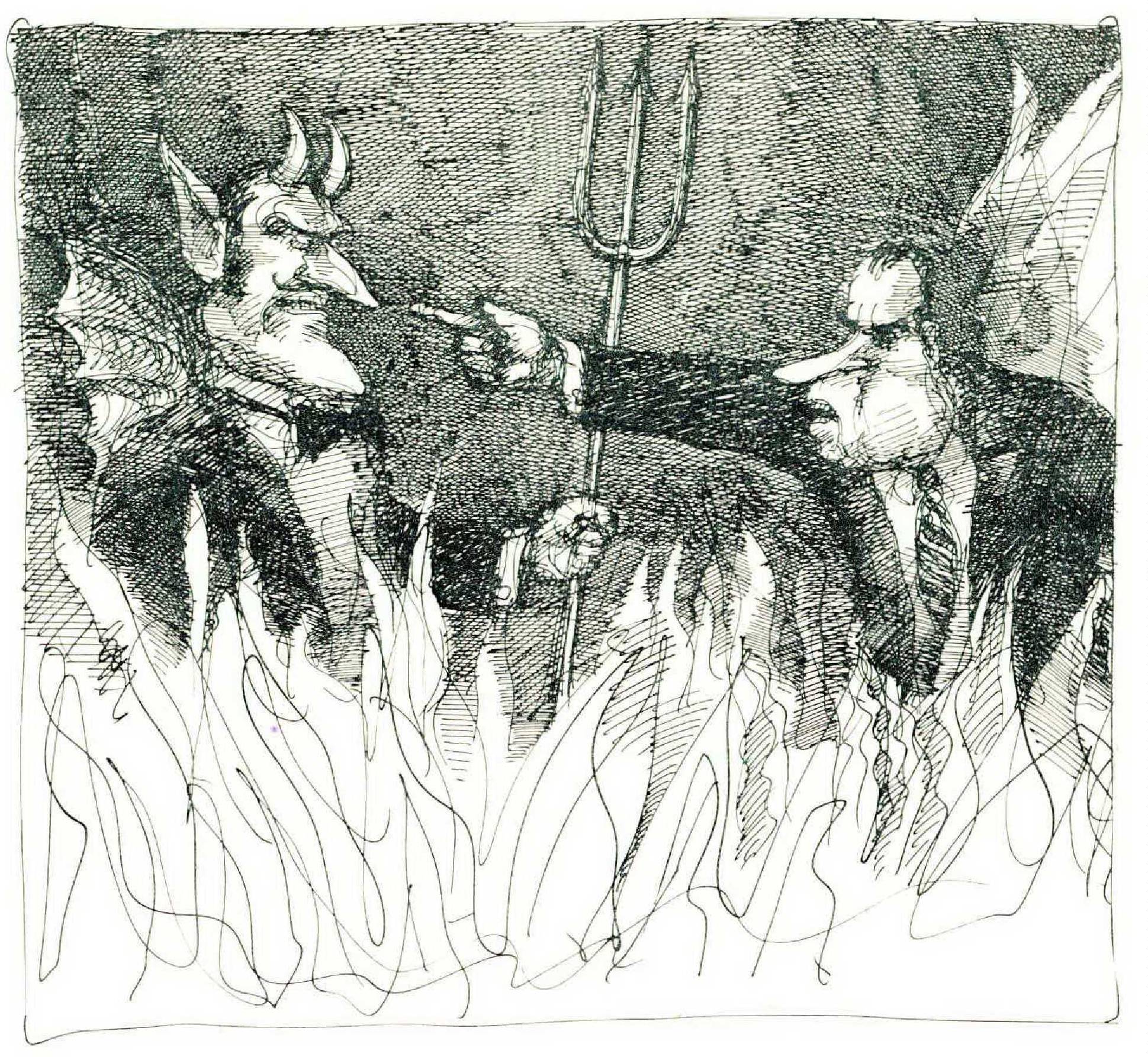 And in the very next chapter he’s alive and well anyway. In Hell, to be sure, but there he is debating the pants off Satan, whom he’s running against for Devil. I subtitle that last chapter “On the Comeback Trail” to suggest that you can’t hold a Trick E. Dixon down, even by stuffing him into a baggie and turning the twister seal.