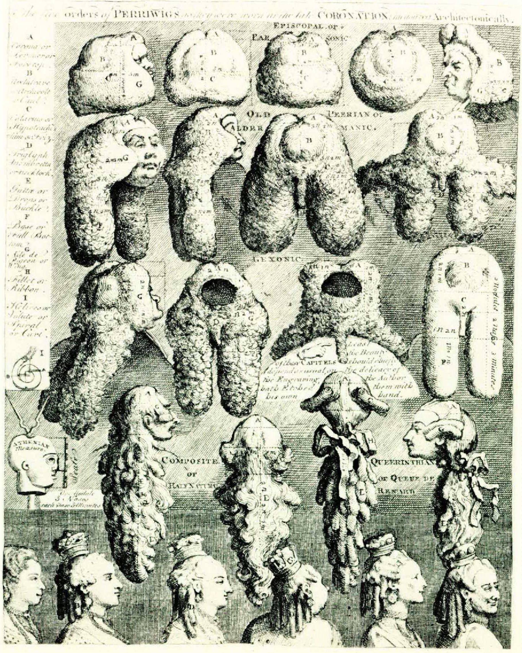 The brightest moment in metropolitan society occurred early in the game, Sennett feels, in the new cities of the eighteenth century, a subject on which he is entertaining though not wholly persuasive. London in 1750 knew, if it knew anything, that the world was a stage, and public life was conducted by the adopting of quite conscious masks. People one met on the street wore literal disguises– elaborate cosmetics, wigs, and coiffures. Sennett’s historical imagination waxes fond over the pouf au sentiment, a confection of hair arranged as a nesting spot for various decorative objects—fruits and vegetables, models of birds and butterflies and cupids. Seen from the present, this seems an inconceivable act of self-display. Sennett’s contention is just the opposite; he views it as a costume, “an attempt to blot out the individual character.”