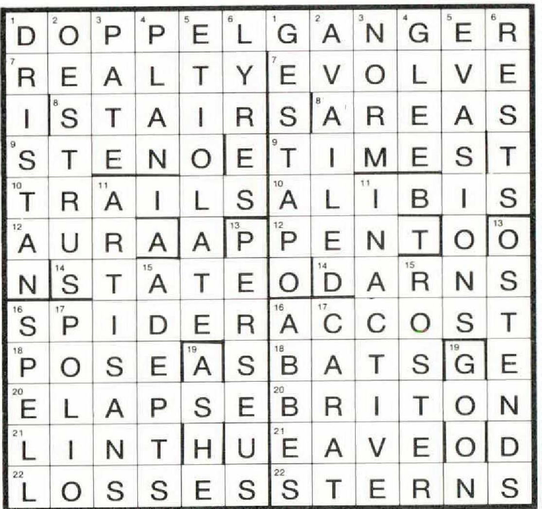 Across. 1. DOPPELGANGER 7. REAL-TY; EVOLVE (love rev. + ve) 8. AREAS (hidden); ST(A)IR 9. STENO (anag.); TI(M)ES 10. ALI-B-IS; T-RAILS 12. PENT (hidden); AURA (hidden) 14. STATE (anag.); DARN-S 16. AC(CO’S)T; SPIDER (anag.) 18. P-O’S-E; BATS (first letters) 20. BRITON (homophone of Britten); ELAPSE (peels anag. around a) 21. Ll(quored-up preside)NT; E(A)VE 22. STERN’S; LO-SSES Down. 1. GESTAPO (anag.); DR(I)S-TAN 2. AVAILED (anag.); OESTRUS (anag.) 3. N-OR-M; P-AT-E 4. PLAN (hidden); GLEE (hidden) 5. EVAS-ION-S (save rev.); ETIOLATE (anag. 4 + e) 6. RESTS ([ac]tress anag.); LYRES (hidden rev.) 11. IN-ACT I-VE; ART-IS-ANS 13. OSTENDS (anag.); PERSEUS (super anag. around se[e]) 15. ADEPTS (tapes anag. around d); ROSTER (anag.) 16. ABBES (anag.); SPELL (double def.) 17. CARAT (hidden rev.); POLIO (pool anag. around i) 19. A-SHE; GO-ON